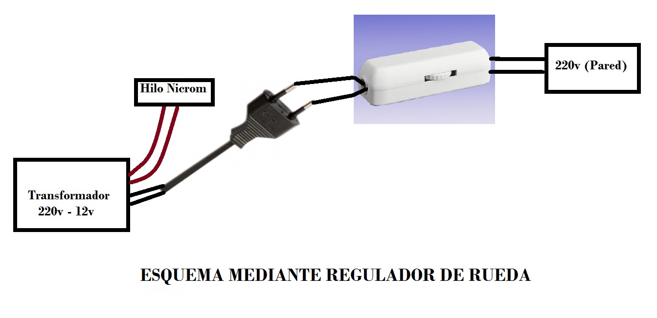 Hola Ismael, yo tengo el regulador de enchufe, el que tu llamas de pared, el esquema lo tienes bien, a mi me funciona perfectamente y lo uso con un hilo de 45 cm, 20 cm y 8 cm, y según la medida le doy mas o menos intensidad hasta que consigo la temperatura adecuada, un saludo y a cortar.