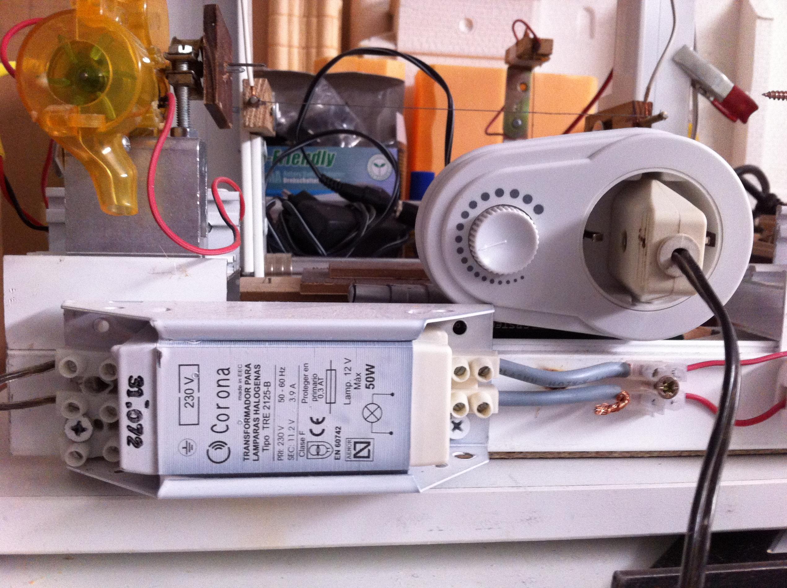 Hola ya tengo mi maquina de porex acabada, he de decir que al final no me ha hecho falta el regulador. El hilo de nicrom es de 0.3 mm y el transformador de 220 v -12 v. Adjunto un par de fotos.