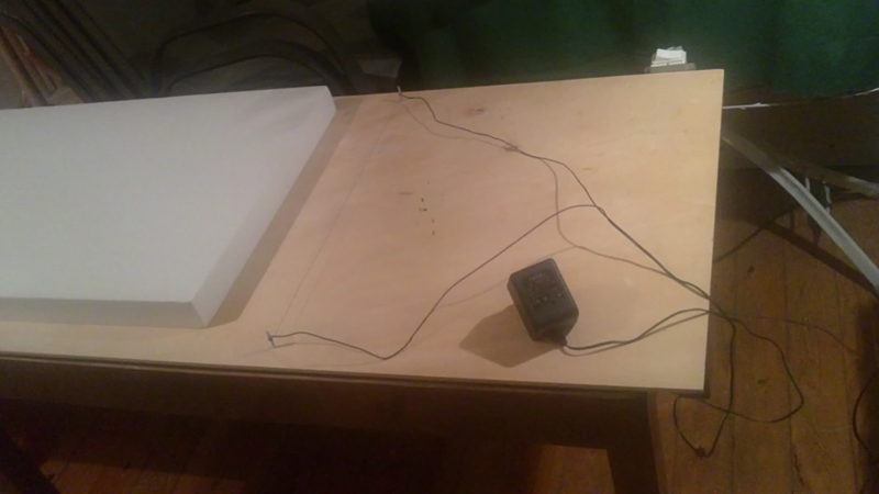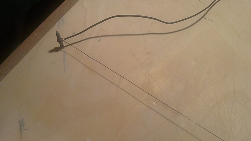 Consta de un tablero, dos tornillos atornillados al tablero, el hilo de nicrom que lo he tensado entre los dos tornillos y el alimentador del viejo ruter que tenía de telefónica por casa. Un lado del cable a un tornillo y el otro al otro tornillo, dando unas vueltas entorno al hilo y el tornillo, y nada más que enchufarlo.