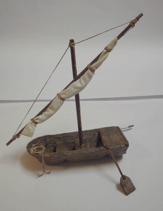 Podemos añadir a la escena algún remo de madera e incluso una bonita ancla realizada con alambre enrollado o comprada en alguna tienda de modelismo, no son caras, lo difícil es encontrarla adecuada para el tamaño de nuestro barco. En mi caso el ancla que podéis ver en la foto del barco ya acabado, está hecha con un anzuelo de 3 "patas" al que se ha cortado una de ellas.