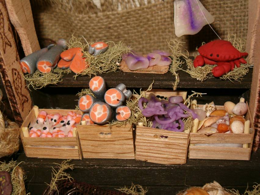 Todos los pescados y mariscos del puesto están hechos con Fimo, si estais interesados puedo poner un paso a paso de como hice las gambas, es muy sencillo y quedan graciosas. El tamaño es de medio centímetro aproximadamente aunque es fácil hacerlas todavía más pequeñas. Muchas gracias por vuestros comentarios. Me alegra mucho que os hayan gustado mis primeros trabajos.