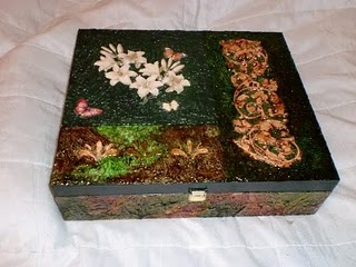 Mi hermana hace esa técnica en cajitas para su hija y amigas. Ela compra las láminas, pero el concepto és lo seguinte: Tienes una lámina con el diseño completo, depués tienes várias láminas menores en que solo aparecen algunas partes del diseño y las colas sobre la ,que és el siseño completo, con un adesivo tridimensional ( como una goma más gruesa). Sobre estas vás encolando otras láminas de partes más pequeñas.