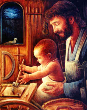 Cuando el tablado estuvo enteramente listo y José hubo dado alrededor de él esa última vuelta del artífice que repasa la labor, doña Amparo, muy acabadita y asmática, le hizo seña de que la siguiese, y le llevó a su gabinete, donde le dejó solo un momento. Los ojos de José se fijaron involuntariamente en los muebles y decorado de aquella habitación ni lujosa ni mezquina, y, sobre todo, le atrajo desde el primer momento una imagen que campeaba sobre la consola, alumbrada por una lamparilla de fino cristal. Era un San José de talla, escultura moderna, sin mérito, aunque no desprovista de cierto sentimiento; y el santo, en vez de hallarse representado con el Niño en brazos o de la mano, según suele, estaba al pie de un banco de carpintero, manejando la azuela y enseñando al Jesusín, atento y sonriente, la ley del trabajo, la suprema ley del mundo. José se quedó absorto. Creía que la imagen le hablaba; creía que pronunciaba frases de consuelo y de cariño infinito, frases no oídas jamás. Cuando la señora volvió y le deslizó dos duros en la mano, el carpintero, en vez de dar las gracias, miró primero a su bienhechora y después a la imagen; y a la elocuencia muda de sus ojos respondió la de los ojos de la viejecita, que leyó como un libro en el alma de aquel desventurado, deshecho física y moralmente por un mes de ansiedad y amargura sin nombre. Y doña Amparo, muy acostumbrada a socorrer pobres, sintió como un golpe en el corazón; la necesidad que iba a buscar fuera de casa, visitando zaquizamíes, la tenía allí, a dos pasos, callada y vergonzante, pero urgente y completa. Alzó los ojos de nuevo hacia la efigie del laborioso patriarca y, bondadosamente, tosiqueando, dijo al carpintero: