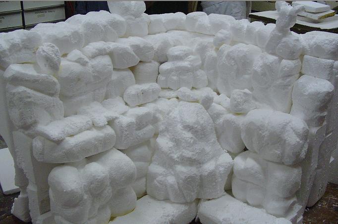 La piedras son todas de porexpan, estas algunas son de los envases y otras de tacos de porexpan cuadrados que tiran en las obras, estan unidas con pegamento de contacto especial para porexpan y pinchadas a la estrutura con palos de brocheta, despues se enluce con escayola para cubrir oquedades.