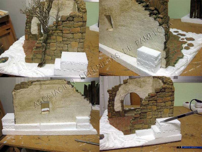 Encima de la plancha que utilizamos de base vamos pegando trozos de porex ,después les damos las formas ,según el tipo de roca que queramos simular .