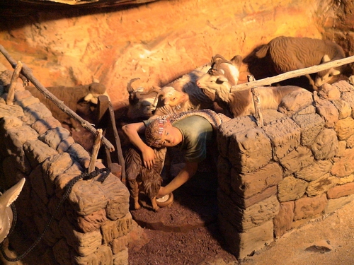 Pero ahora se ha animado a hacer una producción limitada de figuras de semipalillo, que hace en los ratos libres que le deja su producción más artística. Saca los cuerpos y las cabezas con unos moldes y el resto (vestidos, expresión, composición, etc) los compone a palillo (el mismo sistema que utilizan los Colomer) y luego los pinta personalmente. Generalmente no hace figuras sueltas, sino grupos compuestos: mi famoso cacharrero con la borriquita, un pastor con ovejas, un joven acompañando a un viejo, un mendigo junto a un pozo, etc. Los precios son más que razonables y las figuras preciosas, no son "palillos" pero tienen la mano maestra del artista. La producción de este año ha sido muy corta, pero esperemos que el año que viene haga más.