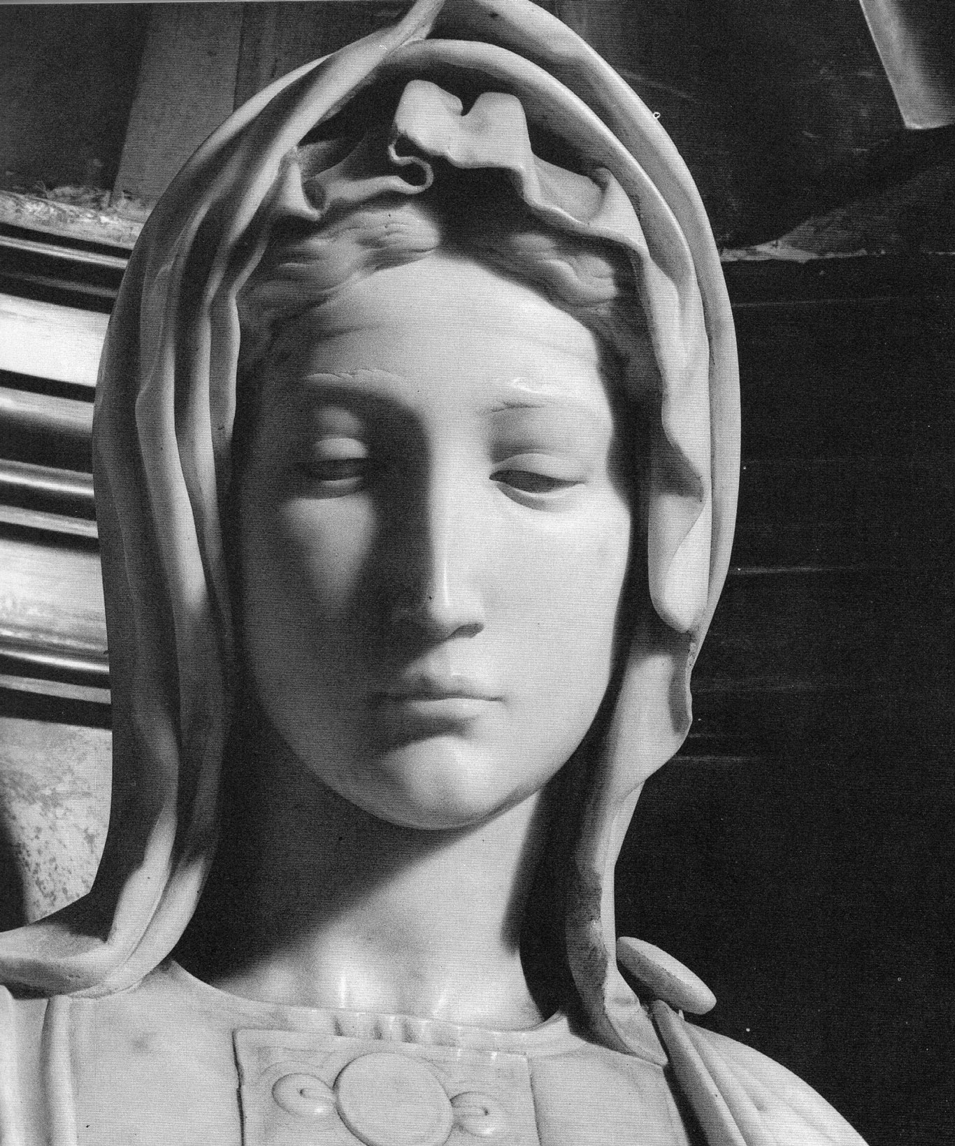 Como puedes ver no se puede equiparar con el genio de Miguel Ángel, son cosas totalmente diferentes , ¿cuál es la mejor? Es como decir que las peras son mejores que las manzanas. Como podrás observar Miguel Ángel sabe sacarle toda la fuerza en la materia, el mármol. Por poner un ejemplo, fíjate como tratan uno y otro pelo, Miguel Ángel tiene volumen, cuerpo, masa, es imponente, pero si sus esculturas las comparas con la realidad no existe nadie de cuerpo y alma que pueda ser así, con esta frente, estos dos bultos encima de las cejas, ¿son chichones? Y el pelo aparentemente desordenado tiene toda su fuerza y ritmo compositivo, no encontraras un mechón fuera de lugar. Todos sabemos que la cabeza humana se divide en 3,5 partes la altura de la frente, y una parte la forma la distancia de las cejas hasta la parte inferior de la nariz, ya que como puedes ver con la La Virgen con el niño de Notre-Dame en Brujas, Miguel Ángel se lo pasa por el forro, y ¿Qué nos da al deformar esta proporción? Pues una imagen, un ser fuera de lo común, solemne, majestuosa y tierna al mismo tiempo, como de hecho lo fue la Virgen. Al contemplar las esculturas de Miguel Ángel prácticamente nadie se para en observar estos detalles, es más no lo he leído en ningún libro de historia del arte, se contemplan las estatuas en su totalidad y se capta enseguida su mensaje, que es lo que importa al fin y al cabo.