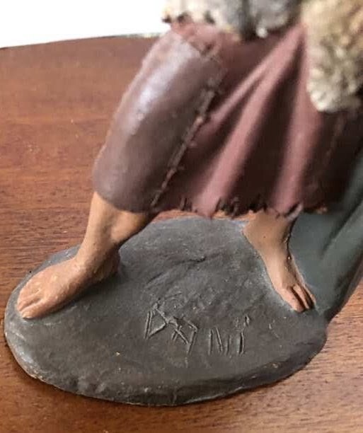 Puede observarse que ya siendo niño trabajaba con el mismo molde avi-Muns de la pastora de su padre. Pero la paleta de colores de la policromía me da la impresión de que tiene tonos mucho más apagados y los patrones de rayado son mucho más metódicos y ordenados. Los de tu figura no los reconozco.