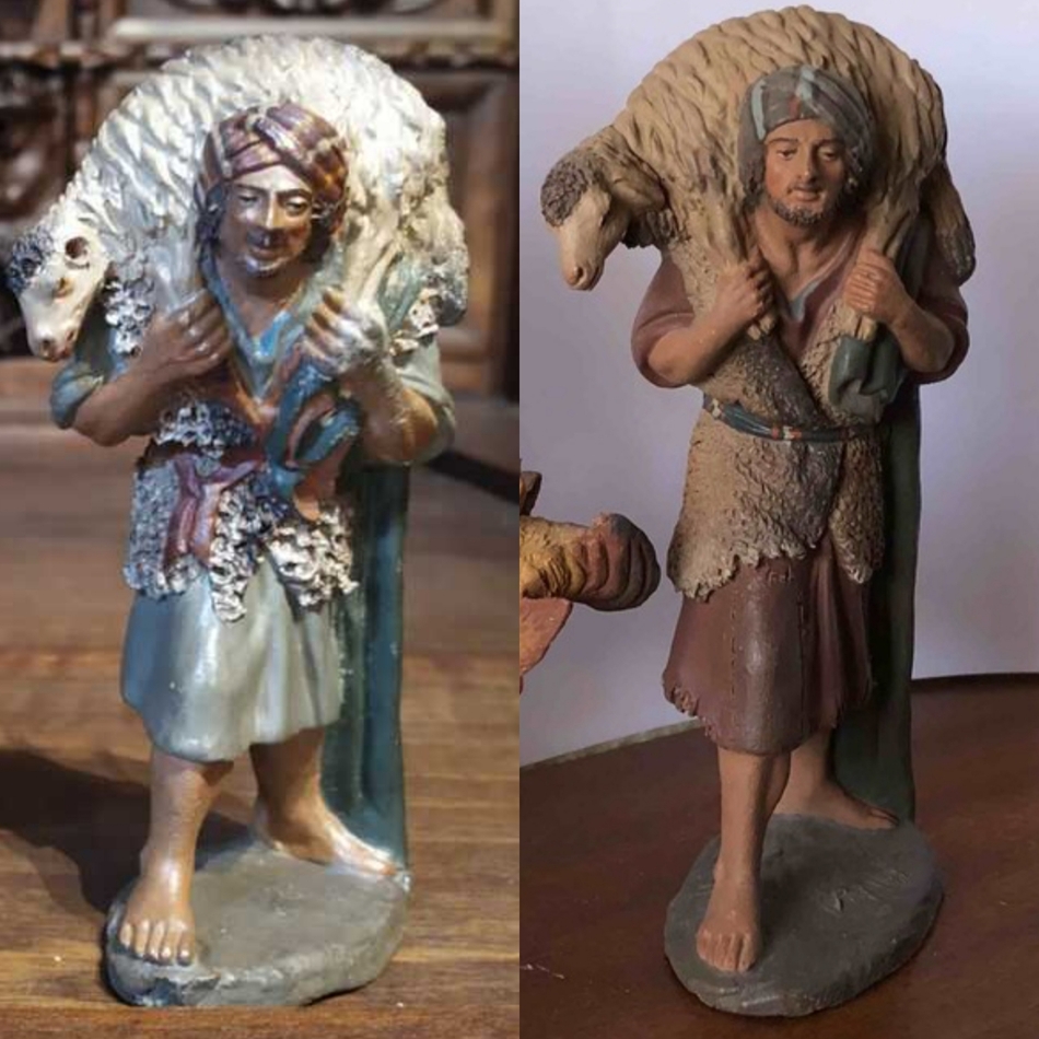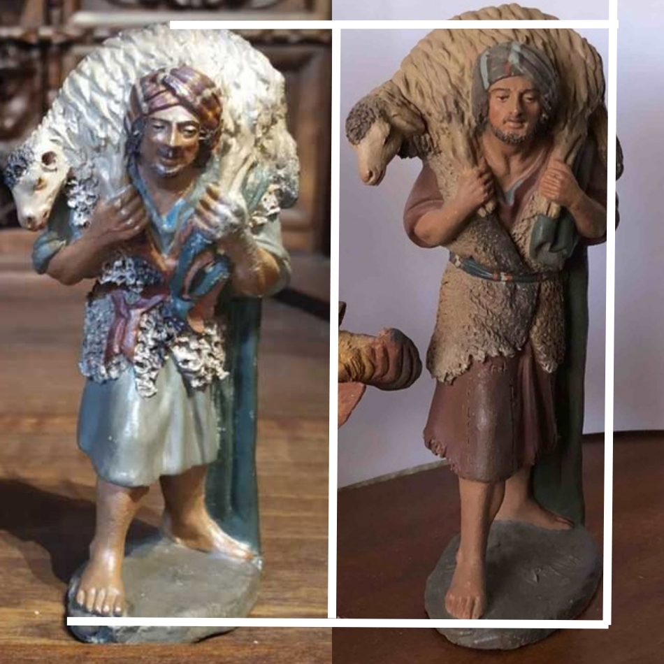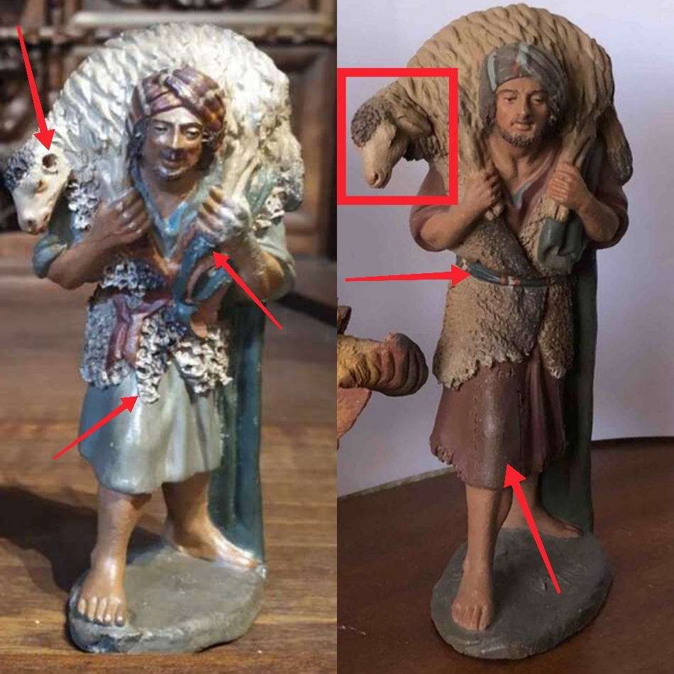 Tercero. En la comparativa que presentas puede observarse con bastante claridad que son la misma figura, y que no existe una evolución de estilo entre ambas —algo que, además, resultaría casi impensable si habláramos de un salto estilístico desde la pastora inicial del padre hasta ese pastor—, sino diferencias derivadas del proceso de seriación.