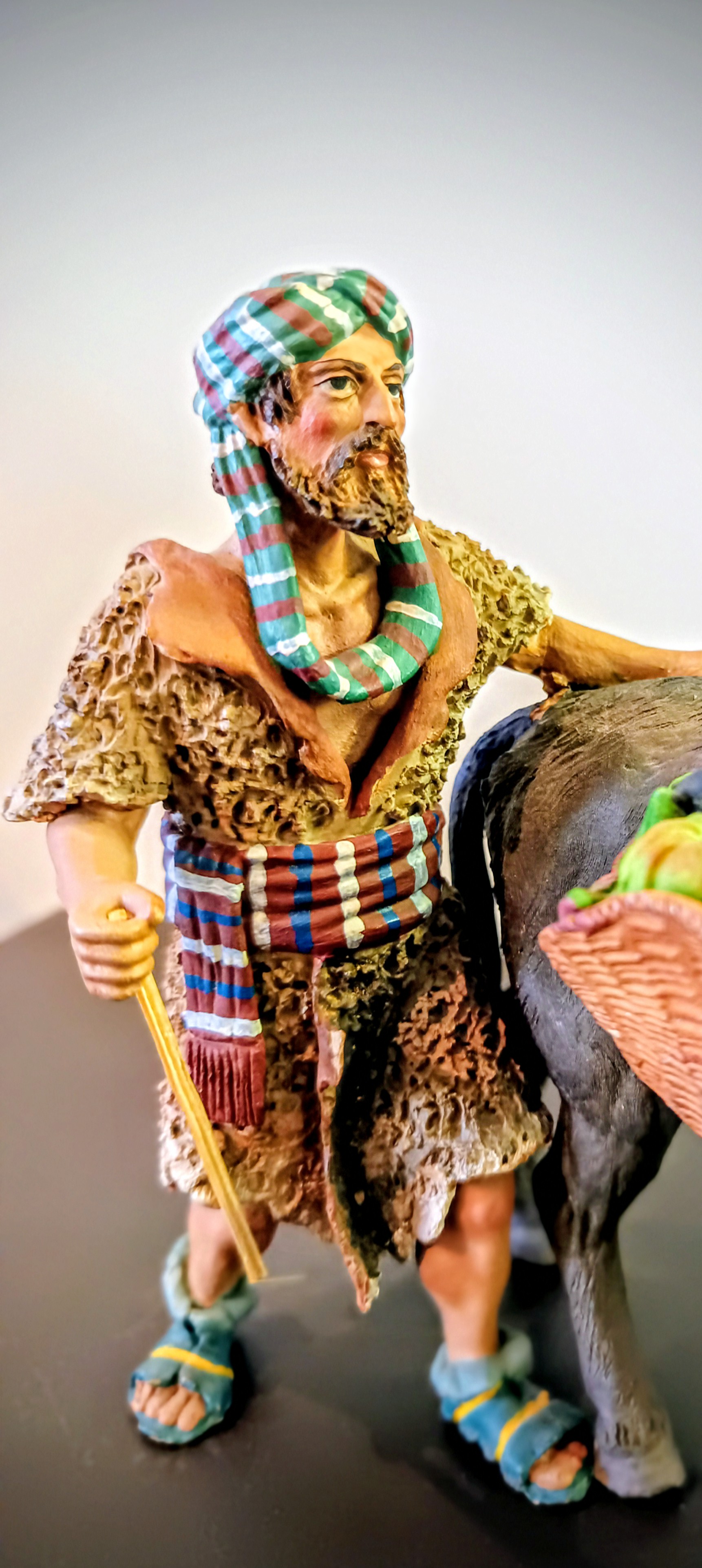 Hay detalles que refuerzan esta conclusión: la oreja metálica en la figura de la izquierda; la pérdida o escasa definición de las pezuñas en el desmolde; el faldón del chaleco de lana resuelto de forma distinta; la cintura menos definida, que obliga a dejar el cinto suelto; y, muy significativo, el parche —tan característico del estilo Daniel— aparece insinuado (o diferente al conocido) y directamente olvidado en la figura seriada del padre. A esto se suman otros detalles que no enumero todos, como la cabeza del cordero, claramente menos afinada.