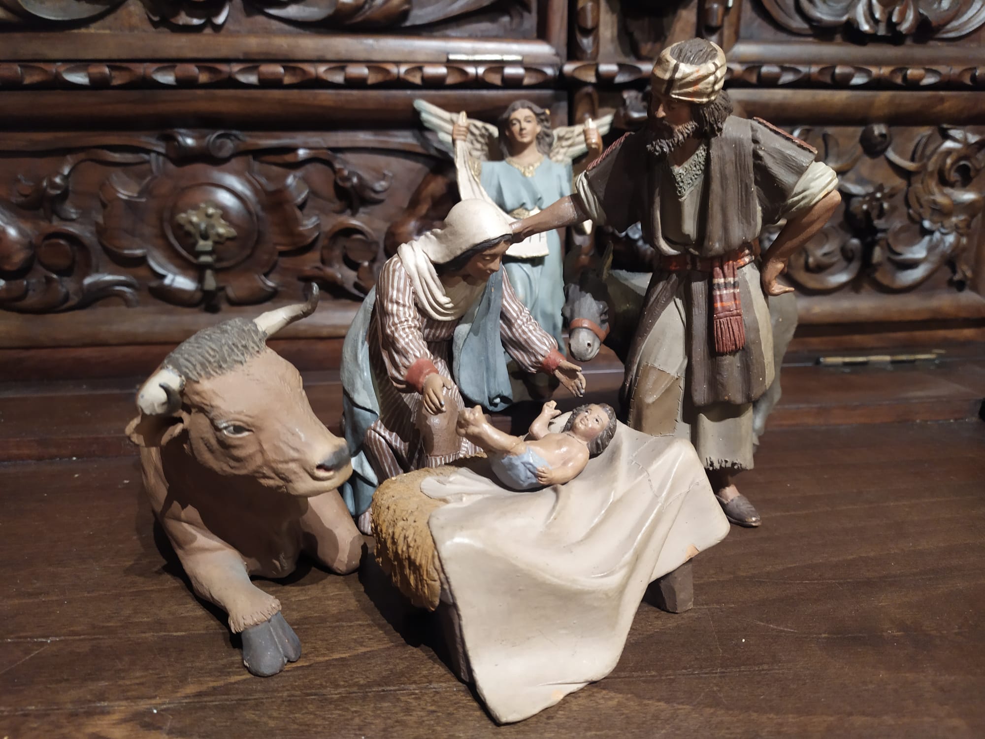 Otra curiosidad y rara es como apuntas el buey, siendo una de las figuras más 'sosas' de pesebre en general (tumbada) y del bestiario del belén en particular aquí parece a estudiar por lo anterior expuesto...