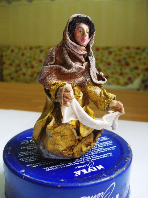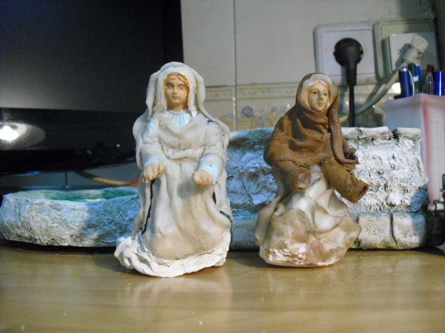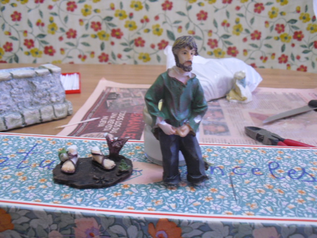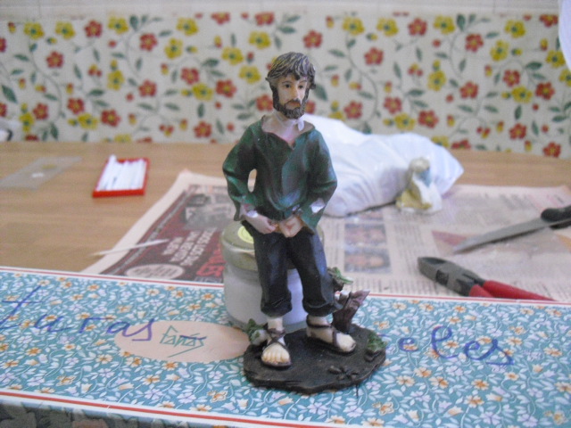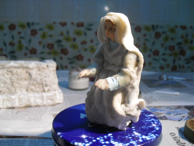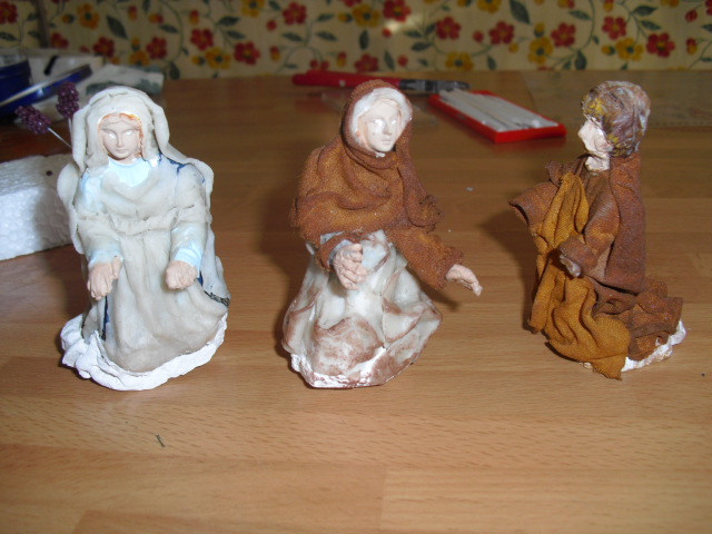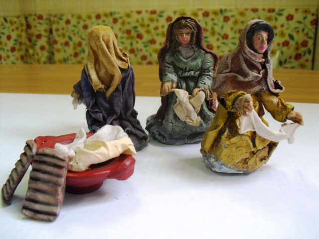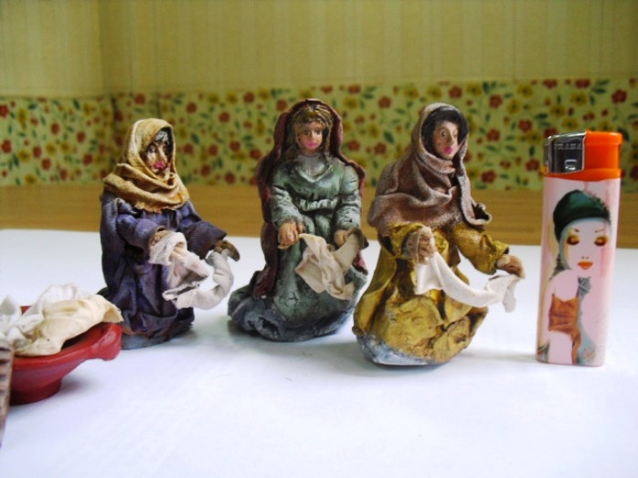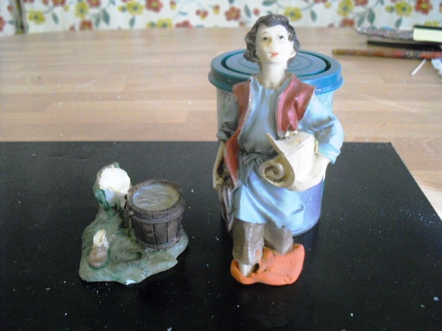 Hola, como necesitaba algunas lavanderas ahora, pues usé unas figuras de pastores repetidos y sin valor y los he transfomado en lavanderas. Estan hechas con porcelana fria y también enteladas y son de unos 7 cm. El barbudo ha salido bastante mal, pero vale para el conjunto, hasta que me compre lavanderas decentes.O pongo unas fotillos, muy malas por cierto, para que veais como quedaron.