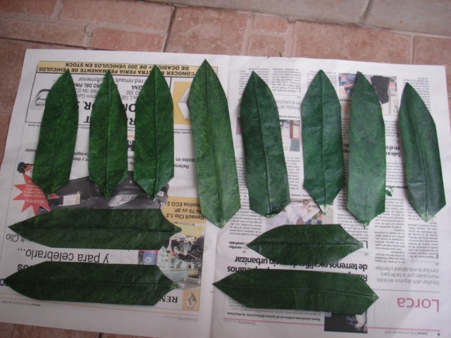los troncos te defiendes bastante bien, por lo tanto pasamos a las hojas, materiales: cinta de carrocero, alambre fino y pinturas en tonos verdes.