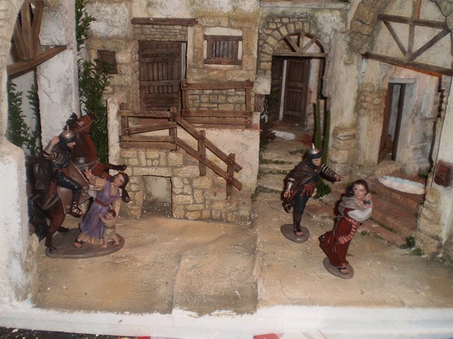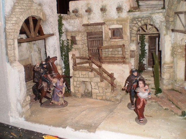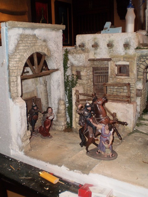 Hola Carlos, (CCAMPOS) no se si te va ayudar,yo dejaría a la mujer de rodillas a la derecha, a la mujer que va corriendo a la izquierda y el caballo en el centro pero como saliendo del arco central un poco avanzado como al borde del diorama y seguiría poniendo al hombre, la mujer y el niño ensangrentado al fondo.