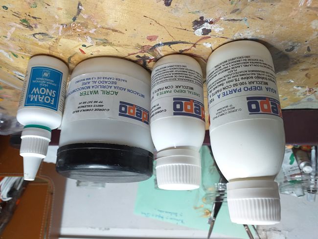 Adjunto la foto de los tres tipos de agua que se gasta en dioramas y modelismo. : Agua calmada estancada, agua movimiento y espuma blanca
