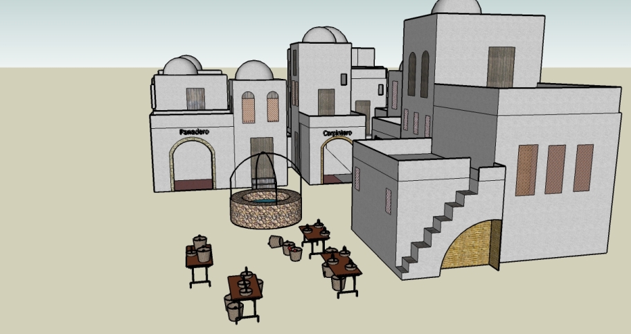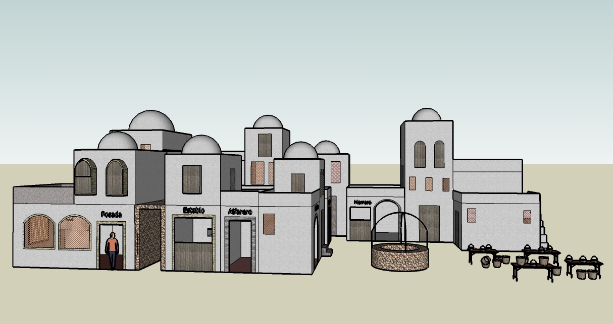 Este pueblo irá encima de una montaña en segundo plano. Abajo de la montaña irá la gruta con el misterio y alguna escena de lavanderas y la anunciación de los pastores.