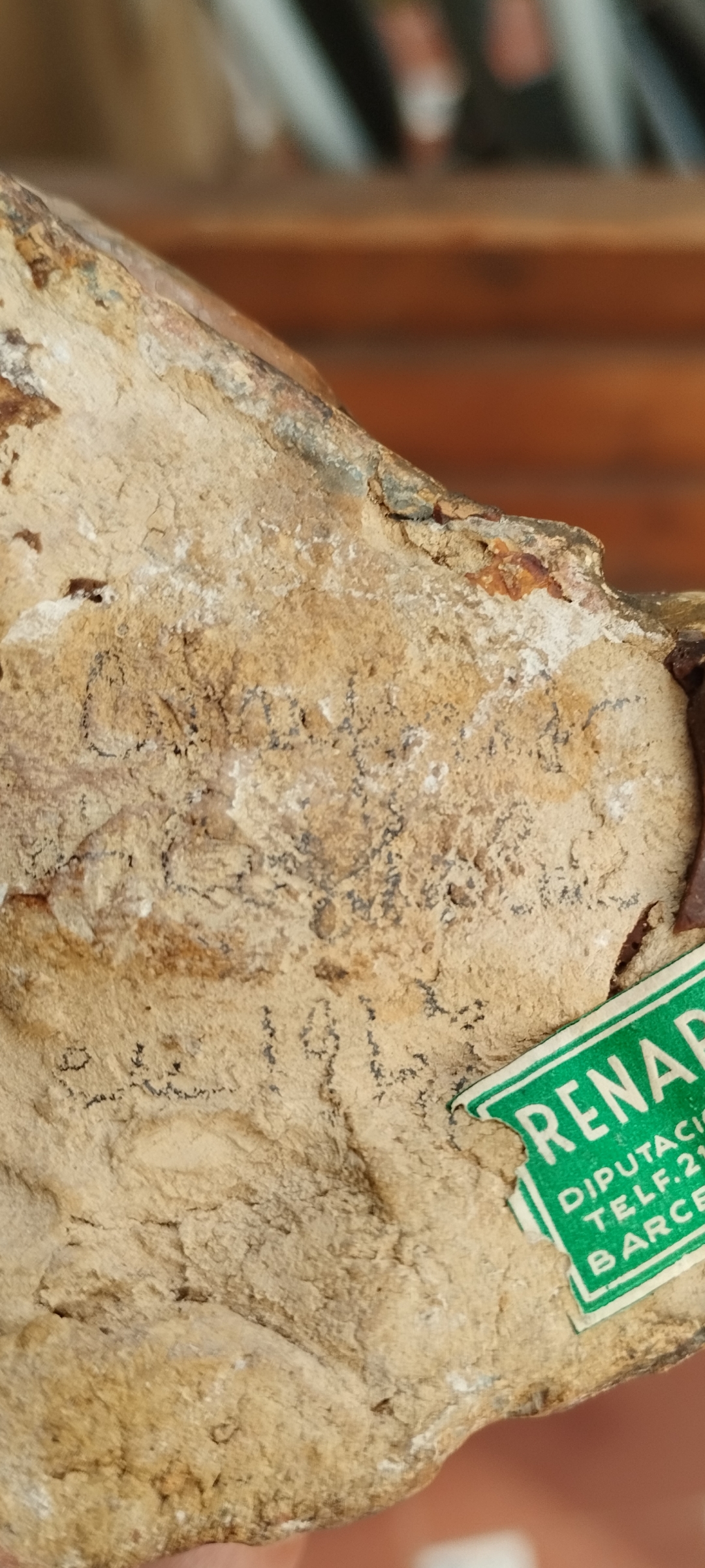 Imagino que te habrás fijado en las anotaciones a mano, hechas a lápiz o grafito. No sé si las habrás descifrado completamente, pero también hay números visibles. La más clara en las fotos es la de la última línea, donde se puede ver una fecha: 1947. Aunque no es completamente nítida, parece distinguirse la palabra "lote" seguida de un número, lo que refuerza la idea de que estamos ante una figura de producción en serie, probablemente parte de un lote de figuras modeladas, tal como indicaría el sello del taller Renart & Cía. Esto sugiere que la figura no es un original único, sino una réplica basada en un diseño de Dionís Renart, realizada dentro de un proceso más industrial, probablemente destinada a la venta en serie. El hecho de encontrar la fecha de 1947(también podría ser el n° del lote) y la palabra "lote" reforzaría esta hipótesis, apuntando a que formaba parte de una producción posterior, dentro del marco del taller de escultura y decoración Renart & Cía, que replicaba originales.