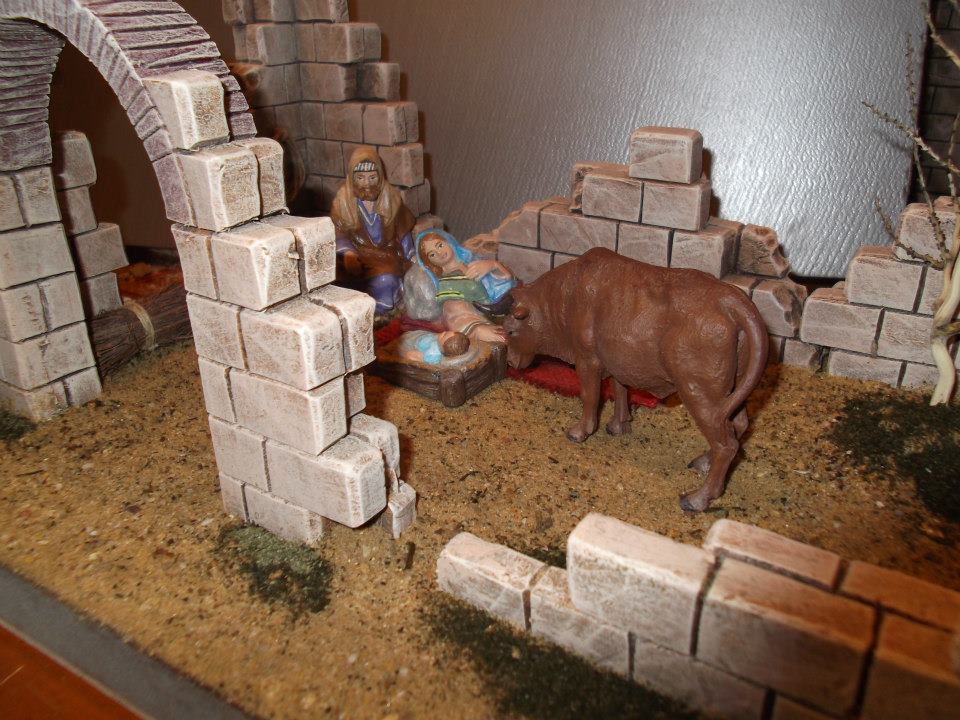 Otro pequeño diorama que he hecho este año, y batiendo un record personal: solo dos días de trabajo. Es para un compañero del coro, otro préstamo. Me lo pidió el viernes, y entre el sábado y el domingo lo he hecho. Solo le falta un detalle de la hoguera, que lo voy a solucionar esta misma tarde. Representa un momento de la huida, un descanso en el camino. Aunque no tenía más figuras de mulas, lo he cambiado por un buey. Sé que no es lo mismo, pero al menos no queda tan vacío.