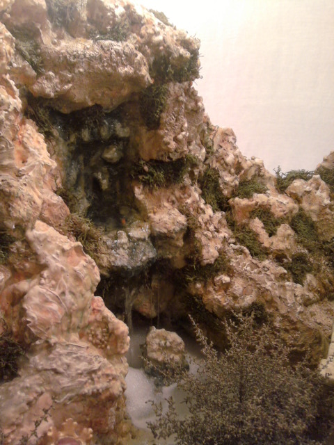 Simplemente he colocado dos planchas de porex en vertical haciendo un angulo recto y luego con otra plancha he ido "despiazando" trozos y los he ido pegando al azar. Cuando el conjunto me ha quedao más o menos rugoso, le he aplicado varias capas de aguaplast intentando tapar las formas que no quedaban "reales", e incluso añadiendo mas trozos de porex para tapar agujeros por donde se colaba el aguaplast y era muy dificil taparlos solo con la mezcla.