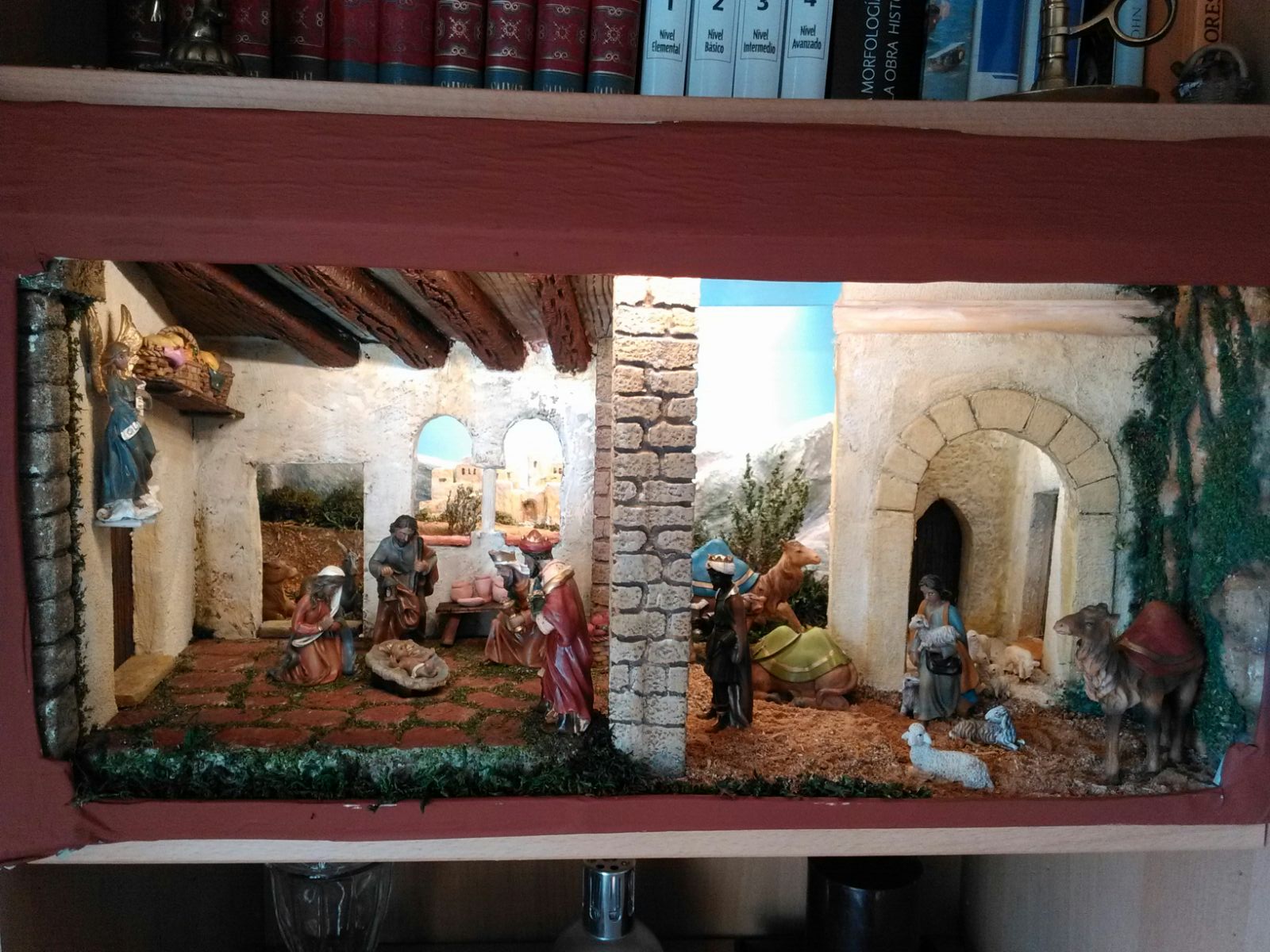 Recién incorporado a este magnifico foro, he aprendido muchas cosas sobre belenes y como resultado he confeccionado este pequeño diorama de 56x30x36 cm.,que es el hueco de la estantería del salón. Las figuras son las típicas que venden en un pack de 11 (las compre hace poco en Zaragoza) de 9 cm. Los camellos son de la tienda de chinos. Las luces son led de Ikea (DIODER). En el tercer plano imito las murallas de Jerusalen sobre unas montañas. El segundo plano lo intento delimitar con arbolillos hechos con tomillo y la silueta de los camellos. El primer plano divido el escenario mediante un pilar quedando el portal a la izquierda y el arco con la hiedra a la derecha. En el suelo para que desprenda un buen olor cuando los visitantes se acerquen, he incluido sobre el serrin una mezcla de canela, cardamomo, nuez moscada y café. Ha sido una gozada poder aprender en este foro los trucos suficientes para disfrutar estos dias pasado realizando el diorama. a ver si puedo enviar las fotos..