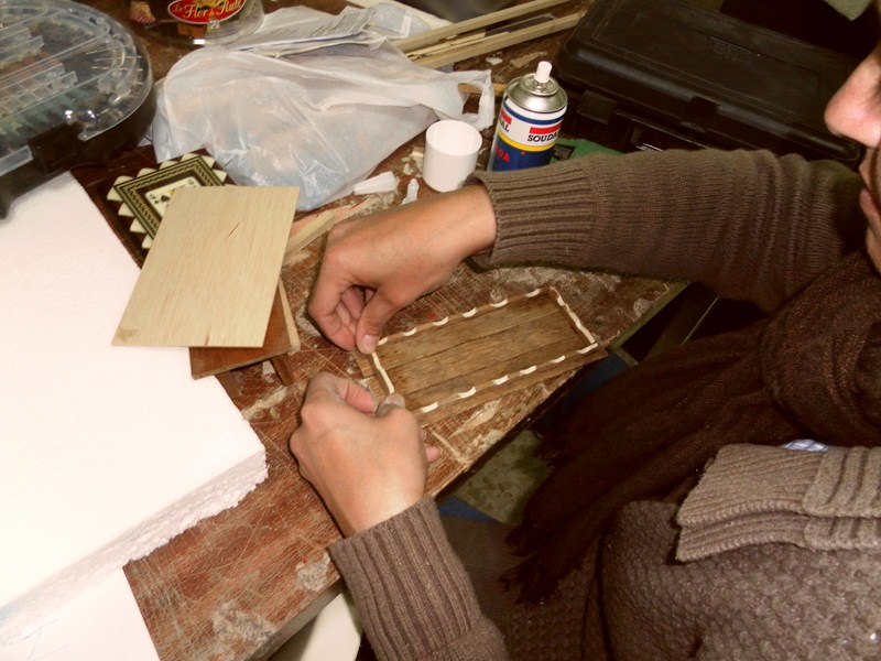 Mientras, preparamos la tapia trasera que se ve detras de la ventana y de la puerta, marcando algo mas de lo que se ve atraves de ellas (12), se marca el cuadro maximo y a la altura a la que van la ventana y la puerta (13), y se van poniendo los lugares donde van los desconchados (14), y se rebeja 0,5 cm. cada uno, se cortan ladrillos de 1,5 cm. X 0,5 cm. X 0,5 cm. (15), se van pegando los ladrillos (16)(17)(18), y se van preparando todos (19), una vez seco se va poniendo el pegamento de escayola, se va cogiendo por la parte de abajo de la paletina y se va hechando de dentro a fuera, haciendo un giro de muñeca (20)(21)(22), y se le va dando forma, incluso las grietas (23), siempre se le va dando forma, intentando que no quede cuadrado, que sea amorfa (24), se deja que se seque y sigue (25)(26)(27)(28).
