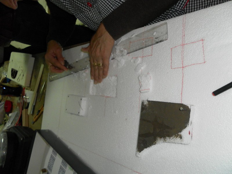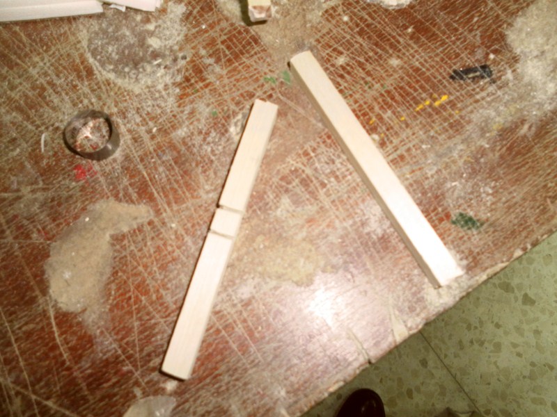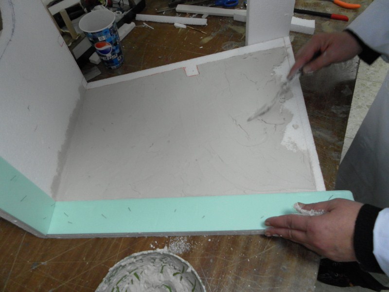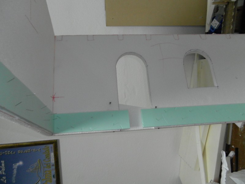 Con una tira de porex de 6 cm. de alto y 0,5 cm. de grosor se pone en la parte vaja de la pared (1)(2), para hacer el zocalo, (la tira la he cortado de unos porex comprado en Leroy Merlin, son los aislantes que se ponen entre el suelo y el parquet), y se va escayolando, pero de una forma mas bien lisa, por que es un interior (3)(4)(5)(6)(7), cuando se seque, se protege el zocalo con cinta de pintor, y se le da una mano de aguachirri verde caqui (8). De un rectangulo (9), se hace la forma de la chimenea (10), se vicela , ya que sera de rincon, y se corta la parte por donde va el palo del techo (11), y se escayola.
