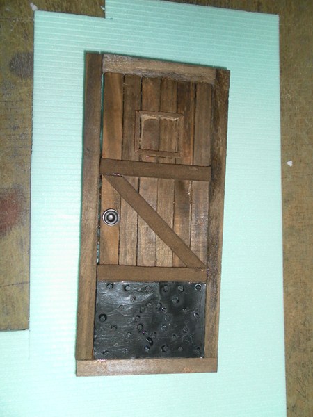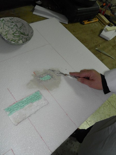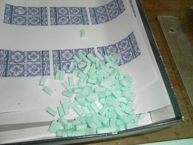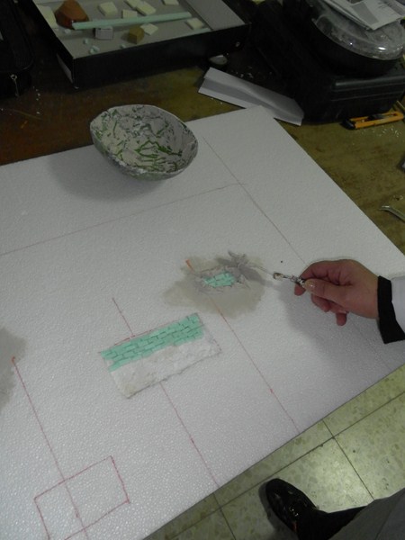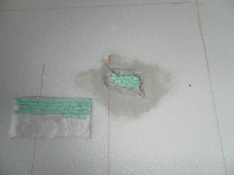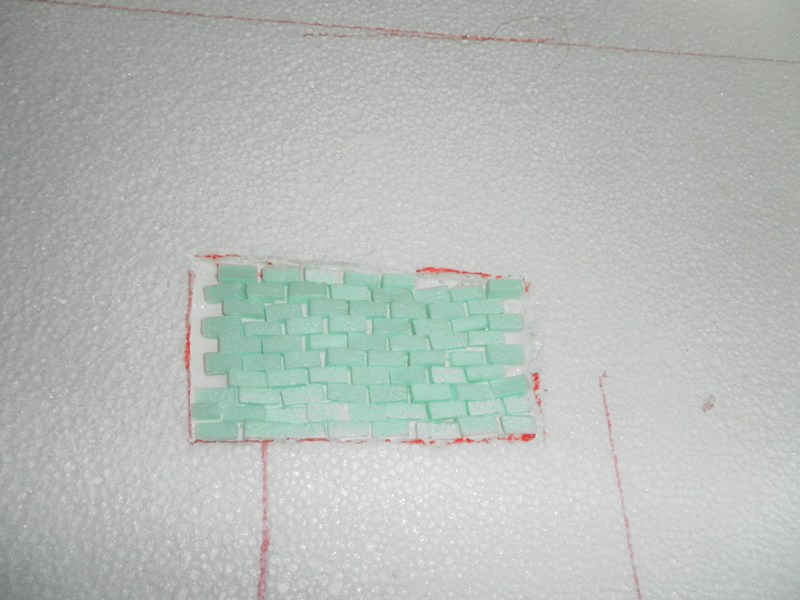 Mientras, preparamos la tapia trasera que se ve detras de la ventana y de la puerta, marcando algo mas de lo que se ve atraves de ellas (12), se marca el cuadro maximo y a la altura a la que van la ventana y la puerta (13), y se van poniendo los lugares donde van los desconchados (14), y se rebeja 0,5 cm. cada uno, se cortan ladrillos de 1,5 cm. X 0,5 cm. X 0,5 cm. (15), se van pegando los ladrillos (16)(17)(18), y se van preparando todos (19), una vez seco se va poniendo el pegamento de escayola, se va cogiendo por la parte de abajo de la paletina y se va hechando de dentro a fuera, haciendo un giro de muñeca (20)(21)(22), y se le va dando forma, incluso las grietas (23), siempre se le va dando forma, intentando que no quede cuadrado, que sea amorfa (24), se deja que se seque y sigue (25)(26)(27)(28).