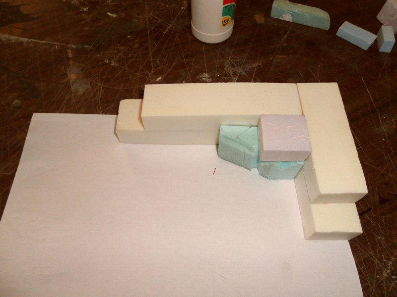 Mientras en la asociacion construimos el interior de la casa, en mi casa adelanto el belen en miniatura, que ira en el diorama. Como las figuras principales son de 17 cm., y las que van en el belen son de 2,5 cm., hemos decidido que la masa del belen tenga 15 X 25 cm. y una altura de 8 cm.. Lo primero que hare es la base de la mesa donde ira el belen, con un troza de madera de balsa la corto a 25 cm., como la anchura de la madera de balsa es de 10 cm., y el de la mesa es de 15 cm., hay que cortar dos tablas, y una se corta por la mitad (1)(2)(3), y se pega (4).