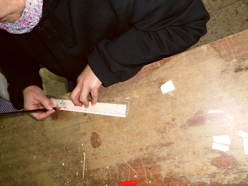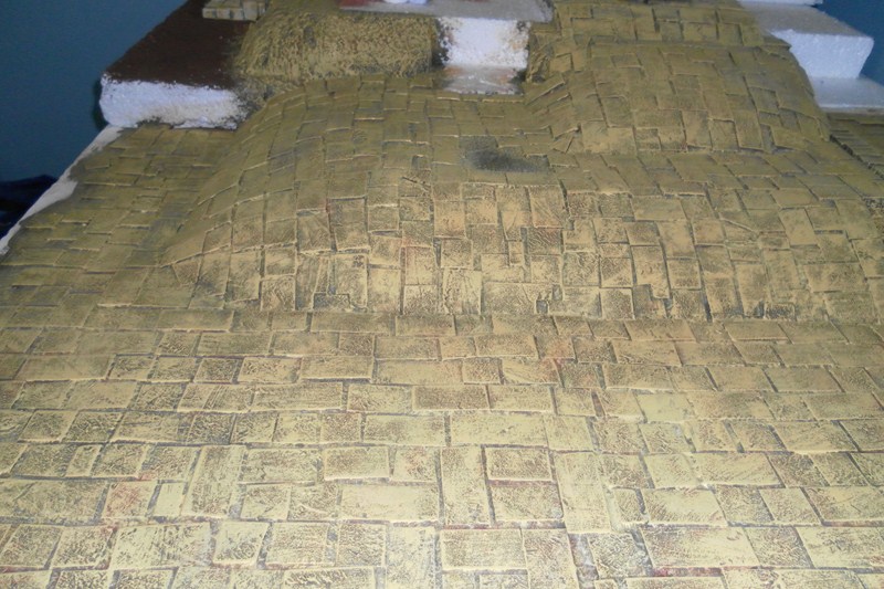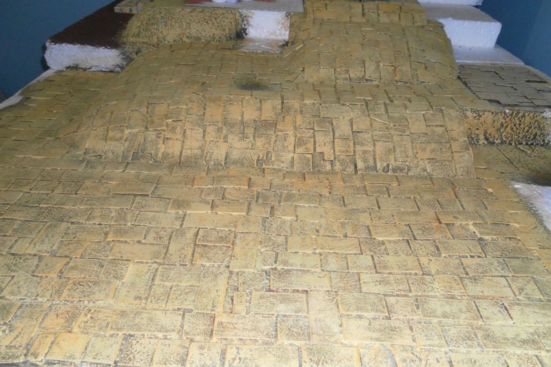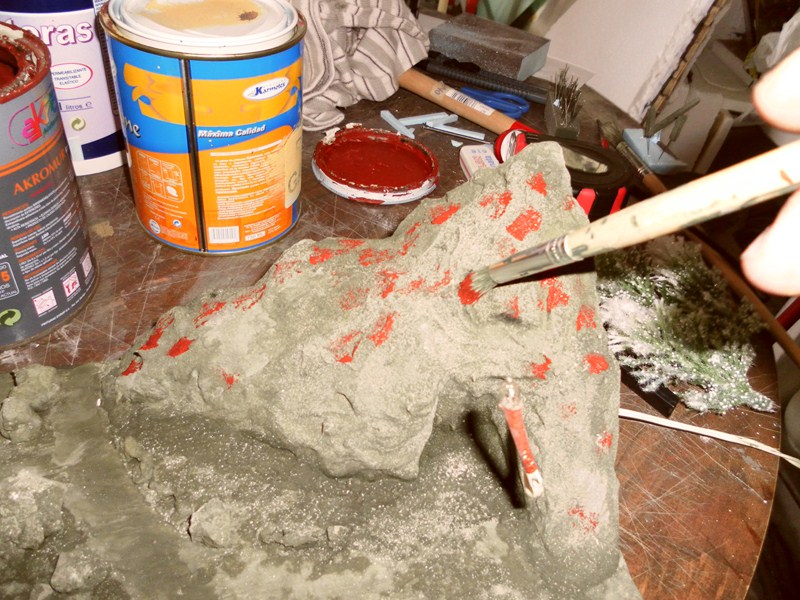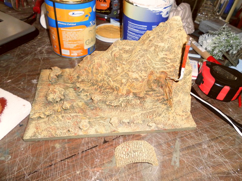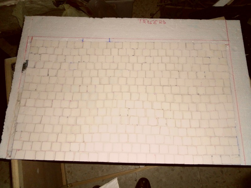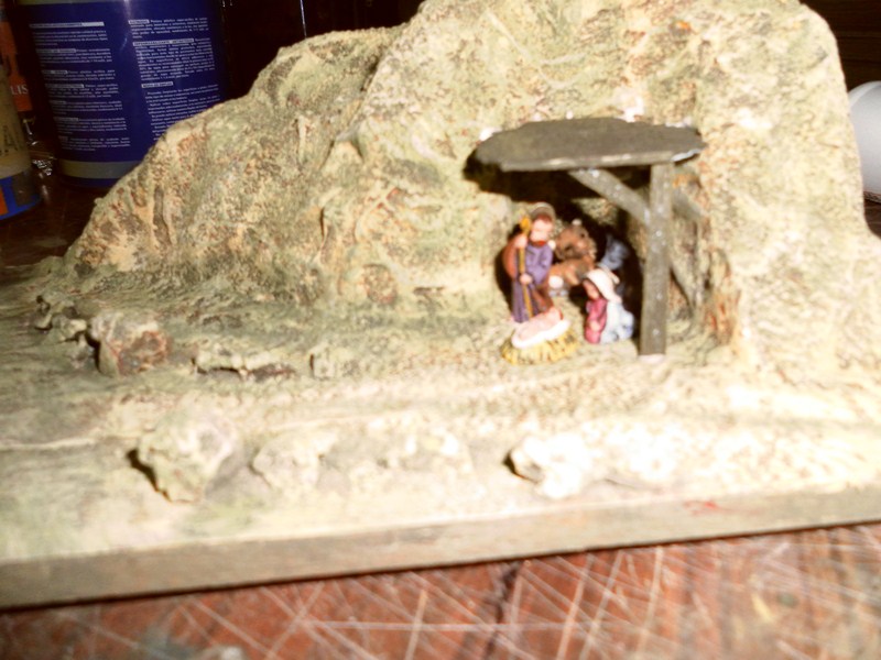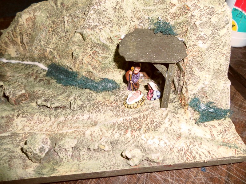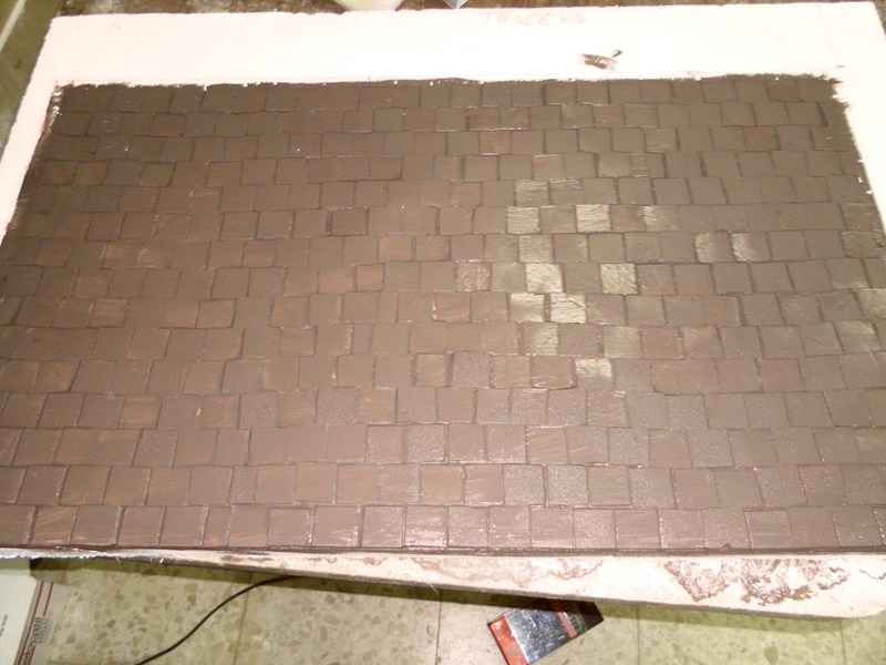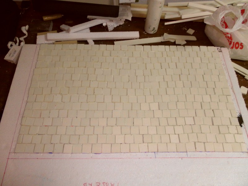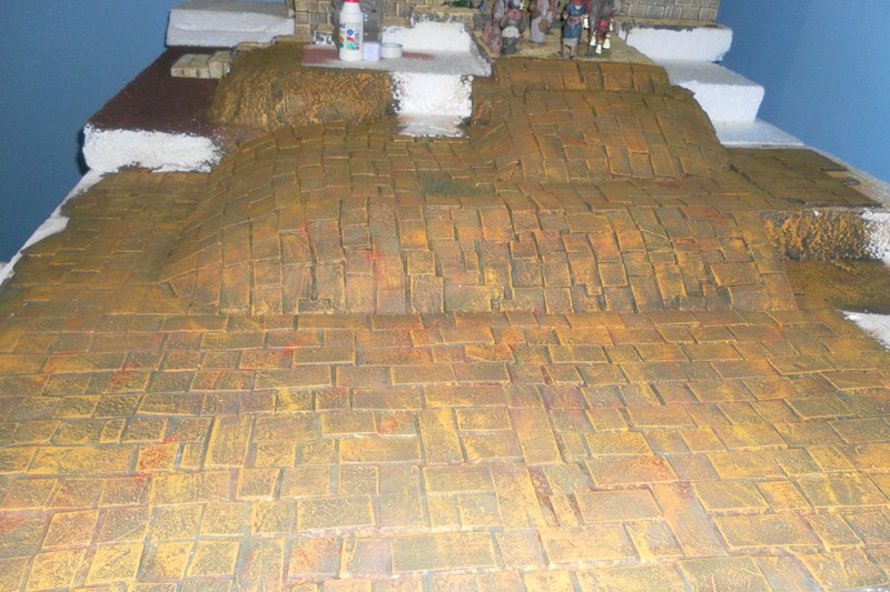 Aqui tengo a mis niñas con la tarea (1), de una plancha de porex del denso de 4 cm. sacamos unas tiras de 1/2 cm. de ancho, y se marcan a 4 cm. para sacar lozas de 4 X 4 X 0,5 cm. (2)(3), tambien se puede cortar una tira de 4 X 4 cm. he irla cortando a 1/2 cm. que daria el mismo resultado. Cuando se tenga una cantidad considerable, se comienza a pegar formando el suelo, se comienza en una esquina, poniendo la primera justo en la union de las dos lineas que se han marcado para saber donde ira la pared, entre loceta y loceta se deja una pequeña llaga, o separacion, todas las locetas que van junto a las lineas deven de ir a ras de ellas, que sera donde apolle luego la pared (4)(5), se ponen todas las lozas hasta completarlo (6), y se deja secar bien, es totalmente imprescindible que esten bien seca la cola, para que a la hora del siguiente paso no se nos estropee el trabajo. A continuacion preparamos una pelota de pegamento de escayola espesito, y se rellena las llagas, asegurandose que no queden agugeros sin escayola, con un trapo humedo con el que se hace en forma de muñequilla, se lava toda las partes de arriba de las lozas, respetando las llagas, que se deve de quedas a la altura de la loza mas baja. Se espera que seque todo bien y con un taco de lija, se le pasa en circulo para que no haya muchos tropezones, pero que no quede como una tablas, respetando algunos desniveles (7). A continuacion hay dos formas de pintarlo, una pintar el fondo de verde y otra pintar el fondo de marron; yo lo hago de la siguiente forma: el verde lo utilizo para el exterior, que siempre hay mas verdina que en el interior. Y marron en el interior que las llagas se vean sucias pero no con verdina (8). Como el proceso de pintado no lo he documentado en fotos, pondre fotos del suelo de hace dos años de mi belen, solo que es un exterior. Empezamos dando con la brocha un poco cargada de rojo turco, puntazos por diversas partes, y seguidamente se descarga la brocha, y a pincel seco se la da un barrido a todo pero sin abusar (9). A partir de este momento todas las manos son a pincel seco y barrido. A continuacion mezclamos el rojo con albero (albero es amarillo intenso, o amarillo oscuro), en el que predomina el rojo (10), y se le va dando mas manos de mas rojo a menos rojo, y de menos albero a mas albero (11), mas o menos 4 ó 5 manos asta llegar a albero solo, que se le da una mano, tras el albero a esta se la agrega blanco, igualmente, de mas albero a menos albero y de menos blanco a mas blanco, teniendo en cuenta que deve quedar un tono amarillento y no blanquinoso (12)(13), para conseguir el color deseado, se deve poner un tono mas bajo del que desea, ya que al final se le da una mano muy muy suabe de blanco o blanco roto, para dar volumen y brillo a las lozas (14), resultado final (15).