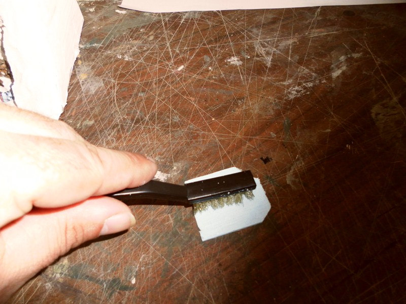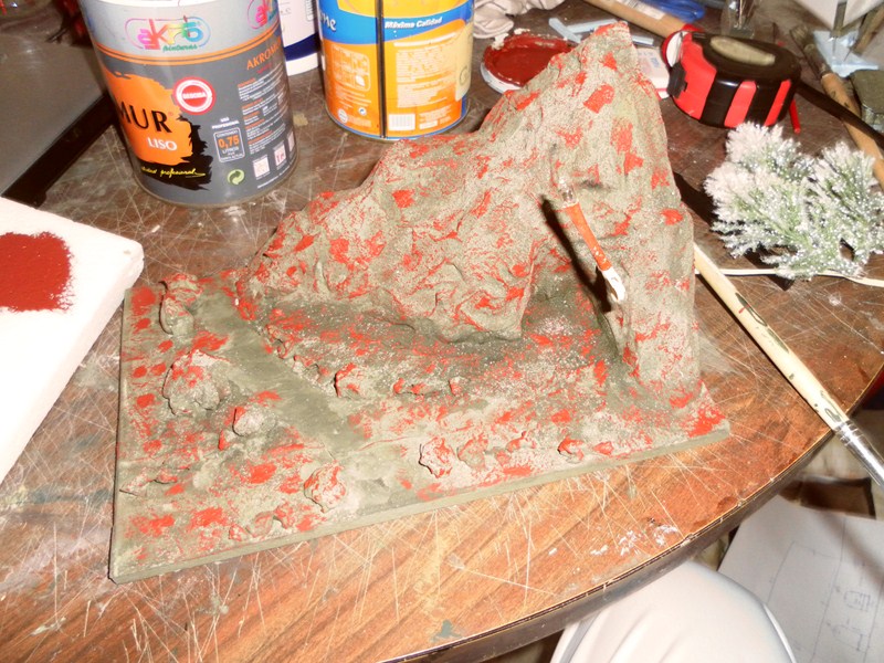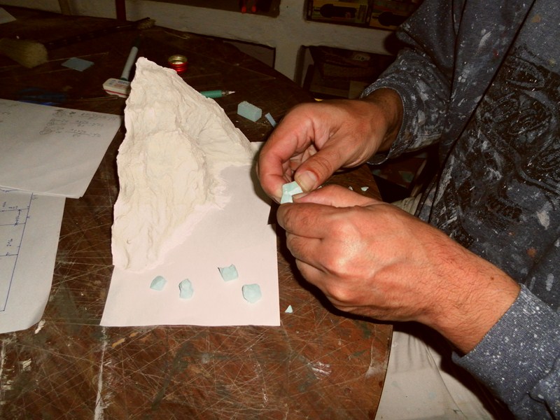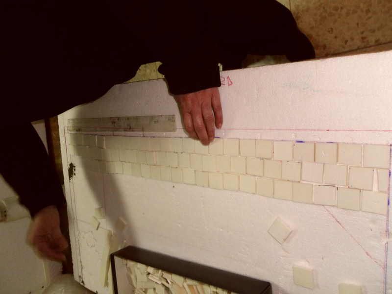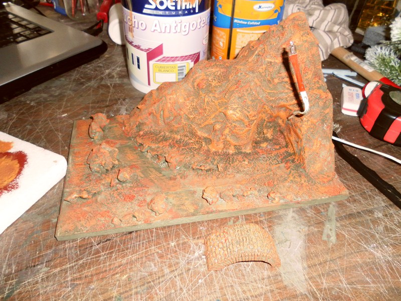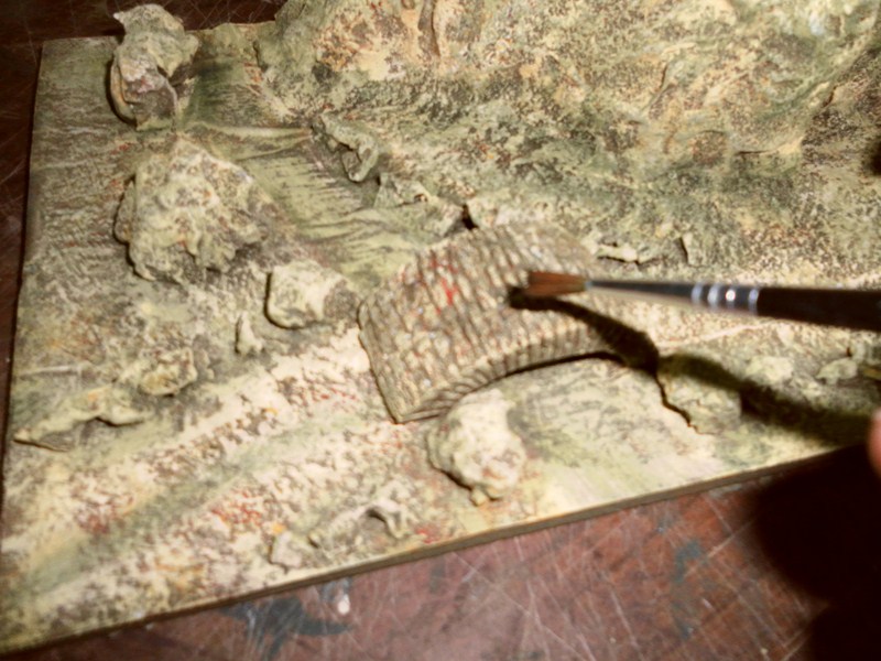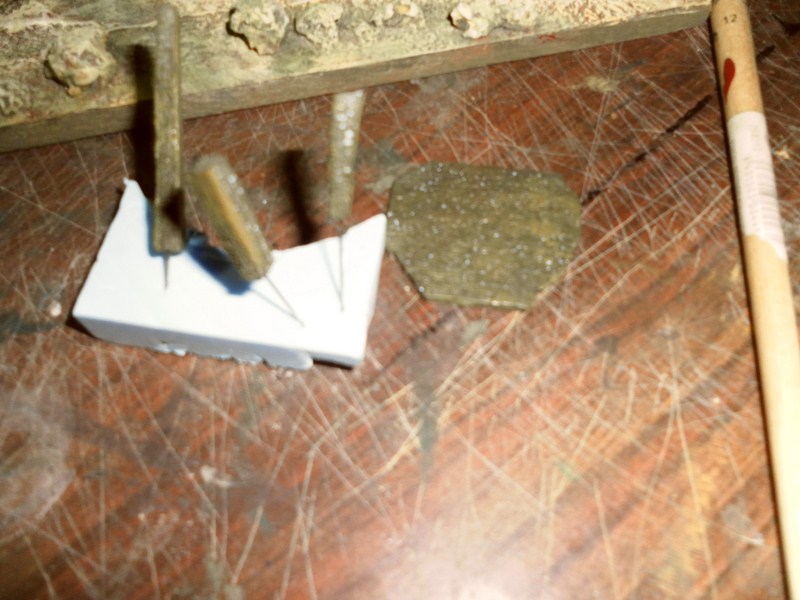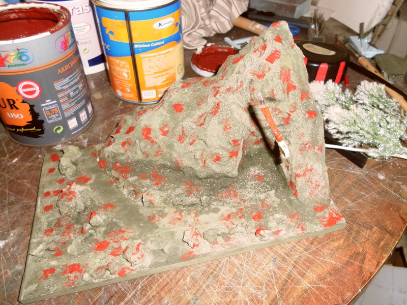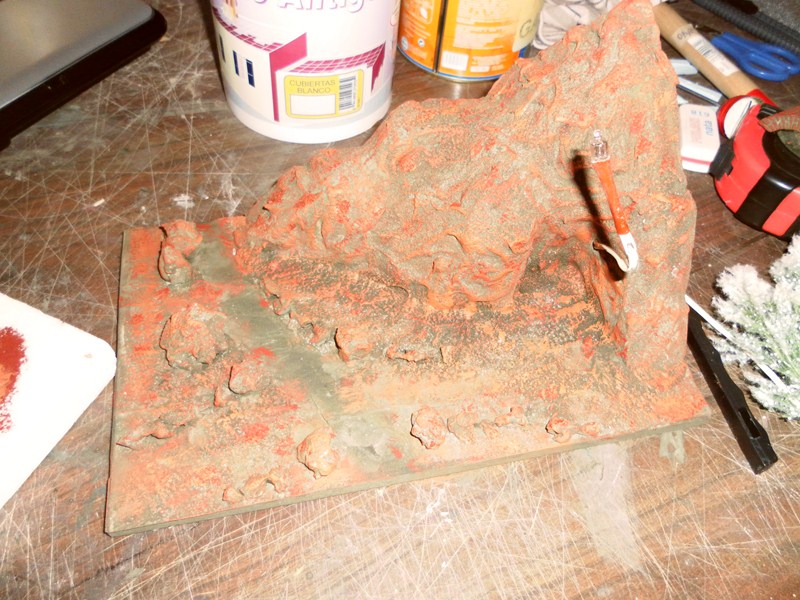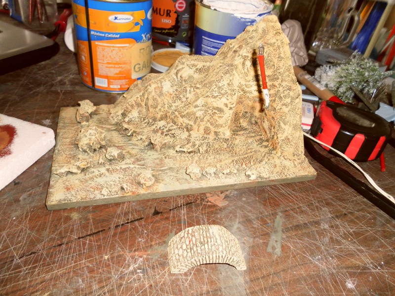 Aqui tengo a mis niñas con la tarea (1), de una plancha de porex del denso de 4 cm. sacamos unas tiras de 1/2 cm. de ancho, y se marcan a 4 cm. para sacar lozas de 4 X 4 X 0,5 cm. (2)(3), tambien se puede cortar una tira de 4 X 4 cm. he irla cortando a 1/2 cm. que daria el mismo resultado. Cuando se tenga una cantidad considerable, se comienza a pegar formando el suelo, se comienza en una esquina, poniendo la primera justo en la union de las dos lineas que se han marcado para saber donde ira la pared, entre loceta y loceta se deja una pequeña llaga, o separacion, todas las locetas que van junto a las lineas deven de ir a ras de ellas, que sera donde apolle luego la pared (4)(5), se ponen todas las lozas hasta completarlo (6), y se deja secar bien, es totalmente imprescindible que esten bien seca la cola, para que a la hora del siguiente paso no se nos estropee el trabajo. A continuacion preparamos una pelota de pegamento de escayola espesito, y se rellena las llagas, asegurandose que no queden agugeros sin escayola, con un trapo humedo con el que se hace en forma de muñequilla, se lava toda las partes de arriba de las lozas, respetando las llagas, que se deve de quedas a la altura de la loza mas baja. Se espera que seque todo bien y con un taco de lija, se le pasa en circulo para que no haya muchos tropezones, pero que no quede como una tablas, respetando algunos desniveles (7). A continuacion hay dos formas de pintarlo, una pintar el fondo de verde y otra pintar el fondo de marron; yo lo hago de la siguiente forma: el verde lo utilizo para el exterior, que siempre hay mas verdina que en el interior. Y marron en el interior que las llagas se vean sucias pero no con verdina (8). Como el proceso de pintado no lo he documentado en fotos, pondre fotos del suelo de hace dos años de mi belen, solo que es un exterior. Empezamos dando con la brocha un poco cargada de rojo turco, puntazos por diversas partes, y seguidamente se descarga la brocha, y a pincel seco se la da un barrido a todo pero sin abusar (9). A partir de este momento todas las manos son a pincel seco y barrido. A continuacion mezclamos el rojo con albero (albero es amarillo intenso, o amarillo oscuro), en el que predomina el rojo (10), y se le va dando mas manos de mas rojo a menos rojo, y de menos albero a mas albero (11), mas o menos 4 ó 5 manos asta llegar a albero solo, que se le da una mano, tras el albero a esta se la agrega blanco, igualmente, de mas albero a menos albero y de menos blanco a mas blanco, teniendo en cuenta que deve quedar un tono amarillento y no blanquinoso (12)(13), para conseguir el color deseado, se deve poner un tono mas bajo del que desea, ya que al final se le da una mano muy muy suabe de blanco o blanco roto, para dar volumen y brillo a las lozas (14), resultado final (15).