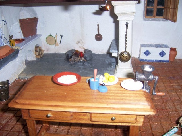 ya que en él he querido representar lo típico de la Navidad en la Mallorca de antaño: el abuelo cuidando del fuego en la cocina de una casa de campo, la abuela haciendo el turrón típico de Mallorca (cocas de turrón: almendra cruda molida, azucar, piel de limón rallada y canela, todo mezclado y aplasgtado entre dos obleas), el padre entrando con el pavo para la comida típica y el niño y la madre haciendo el belén y colgando las "neules" encima del belén. Las figuras van vestidas con los trajes típicos de aquí.