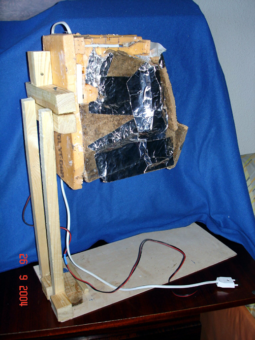 · 09-Acoplamiento del espejo a 45º, donde se encaja el espejo con la escalera en su posición vertical, ajustándolo con los corchos laterales adecuados. Al final se sella con cinta para evitar escapes y filtraciones, sobre todo, de luz.