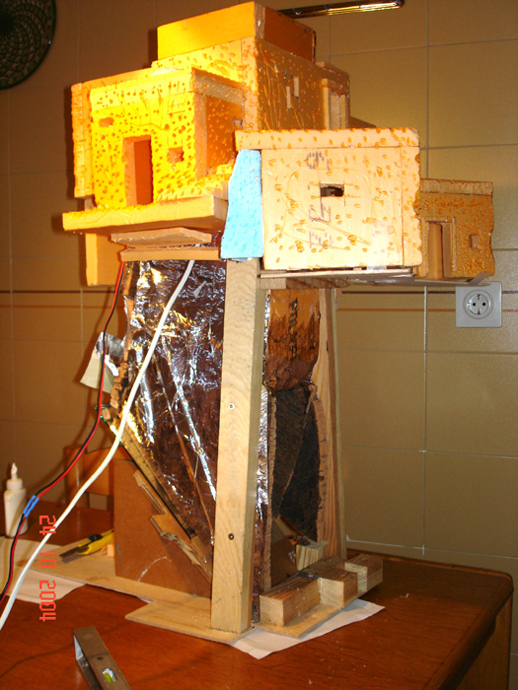 · 204-Disposición del espejo E3, espejo que se coloca de pie en la base girado 45º. La foto permite observar la raja que se ha trazado en el poliestireno y que sirve de “rail” al espejo.
