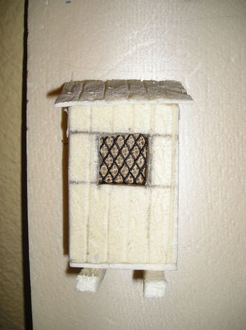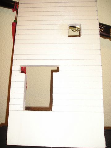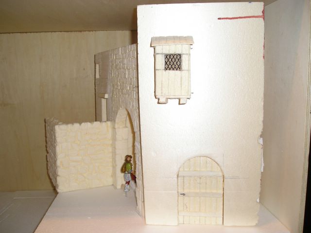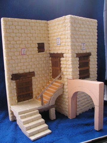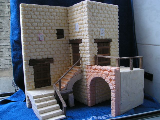 Tenia un problemilla con una casa y gracias a luca_ita por mandarme las fotos y a Josean por su critica constructiva en la foto nº 47 , no tenia suficiente profundidad la casa , asi que la corte por la mitad para hacer un arco y el resultado me gusto . Pintaremos con nogalina las puertas y ventanas , despues de que esten secas le daremos con pincel seco unas pinceladas de blanco para que se noten las vetas de la madera , haremos tambien las escaleras con planchas finas de porexpan ( yo las e hecho de 1 cm de grosor ) .