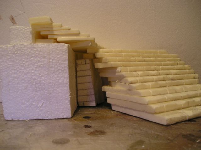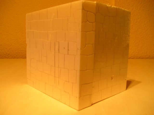 Para la realizacion del muro utilizaremos tambien la punta del soldador y con el cuters daremos cortes a las piedras para dar mas realismo ( a las de las fachadas ) los esquinas de las piedras las escacharemos con un palillo para que no queden tan en punta . ( ver la foto de arriba )
