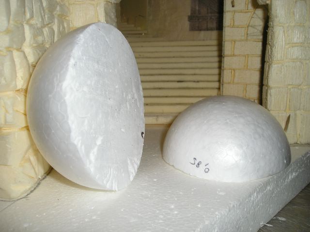 Despues de dibujar las piedras con ( lapiz ) le pasaremos por las lineas con el soldador y con un palillo ( sin punta ) meteremos las esquinas de las piedras un poco para que queden un poco redondeadas .A Suny esta tecnica le gusto . Esta es la fachada de la foto nº 47 cortada por la mitad . Tambien cortaremos una bola de porexpan por la mitad para apegarla en el tejado de una casa .