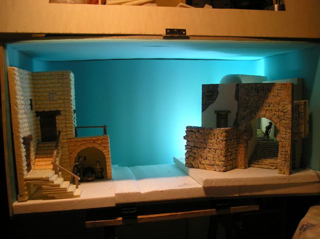 Según vaya haciéndolo os pondré el paso a paso . He construido una caja de madera para hacer el diorama , las medidas son ; 1,10 metros x 55 cm de ancho x 55 cm de alto y el grosor de la madera es de 10 milímetros , me gustaría que se pareciese lo mas posible al de la fotografía ,os pongo también la dirección de donde lo conseguí .  http://xoomer.alice.it/simone.fenili1/mostre.html   Las figuras que quiero poner y tengo que comprarlas todavía son el nacimiento y los reyes de 12 cm. y otras figuras de 10 y 8 cm .