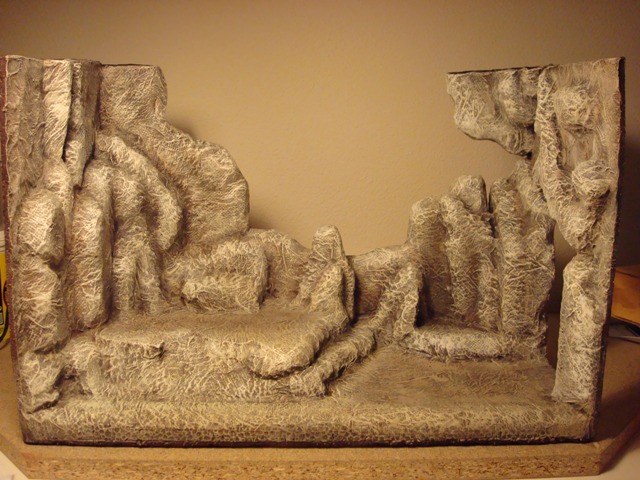 El diorama está en el hueco de una estantería de 43cm de ancho x 39cm de fondo. El primer plano ocupa 20cm de fondo y tengo intención de forzar una perspectiva de un pueblo sobre una montaña o de una colina con ovejas pastando.
