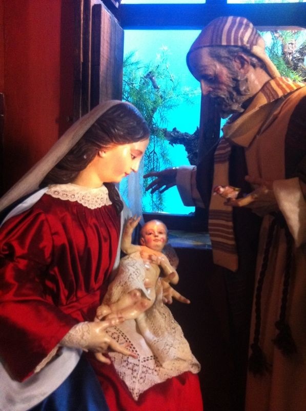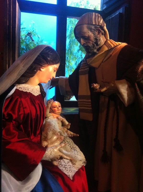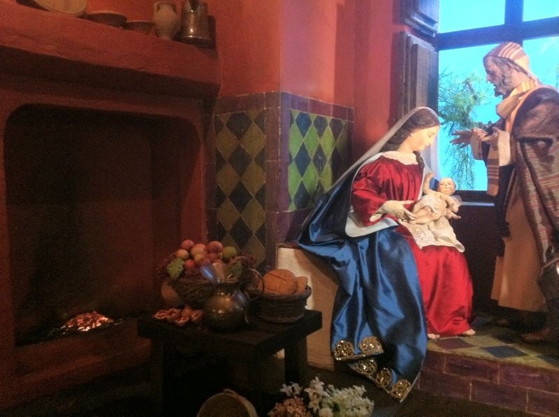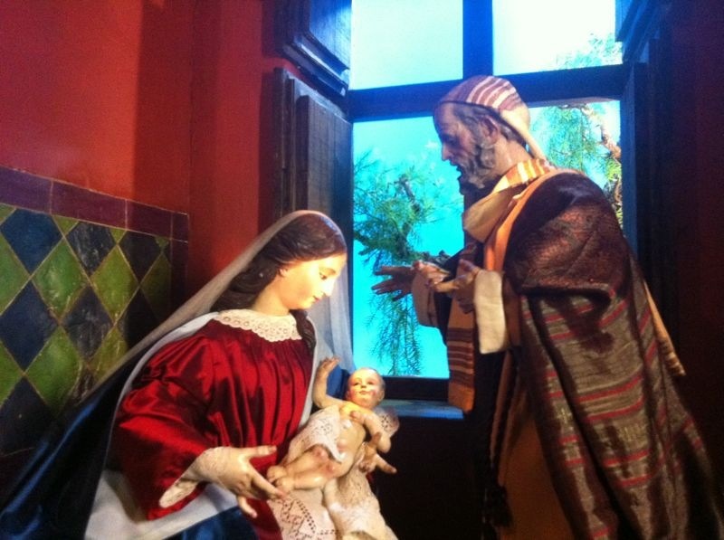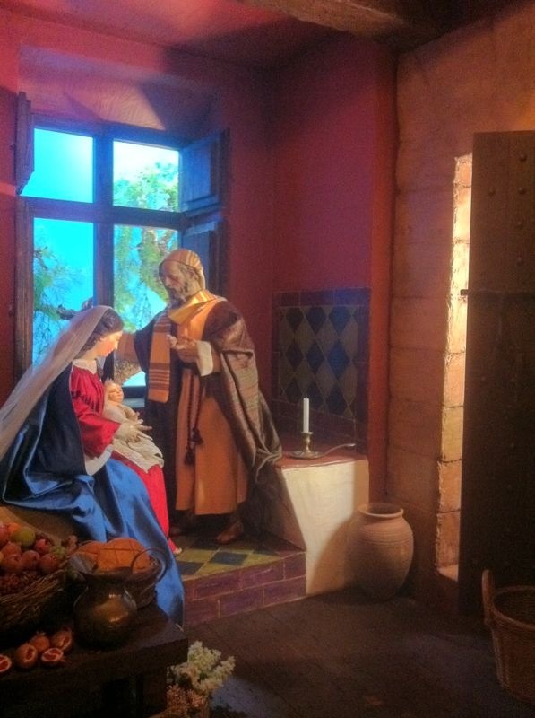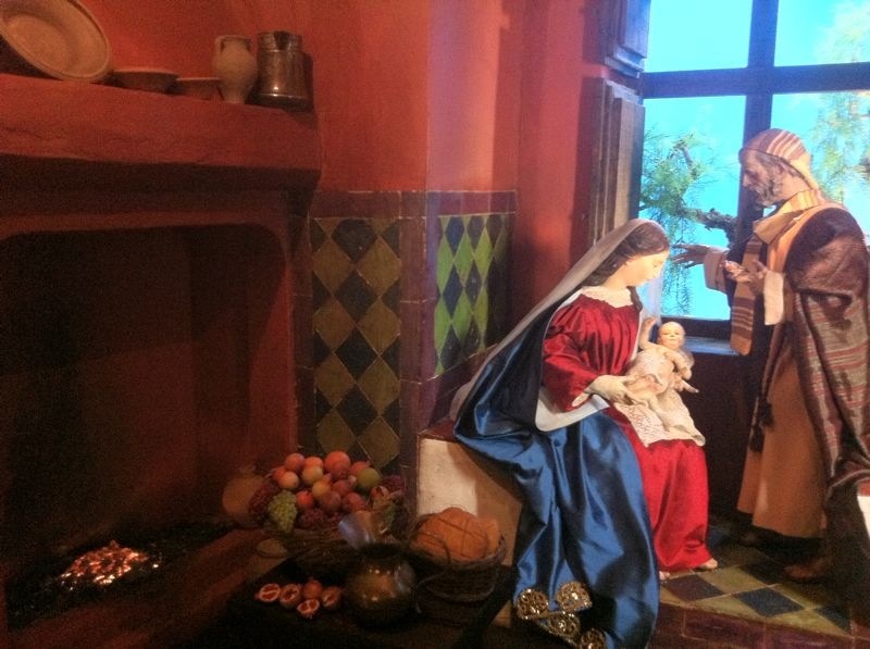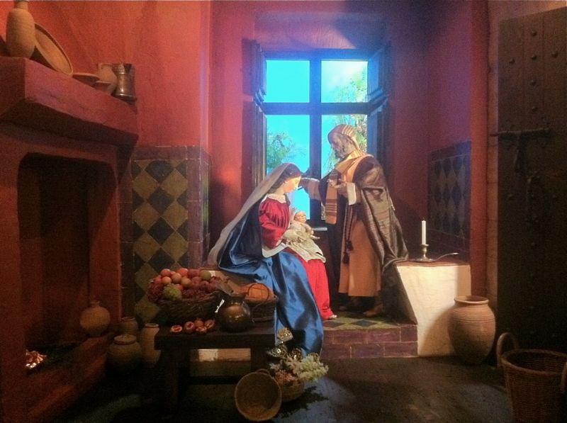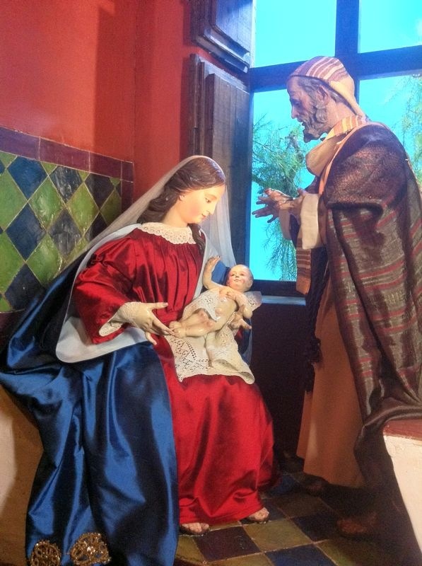 La Sagrada Familia se sitúa en un ambiente de estilo renacentista, con cuidados detalles en la construcción y sus elementos decorativos. Jesús niño es humano y divino. Una doble condición que le recuerda el tierno jilguero, símbolo de la Pasión, posado en la mano de San José. La luz del nuevo día lo invade todo y el cielo azul contrasta la tierna escena. El diorama mide 150 de ancho por 150 de fondo. Las figuras, obra del imaginero Dario Fernandez,tienen 60 cm. de altura y son articuladas.Estrenan ropajes cada año, en función de la escenografía.