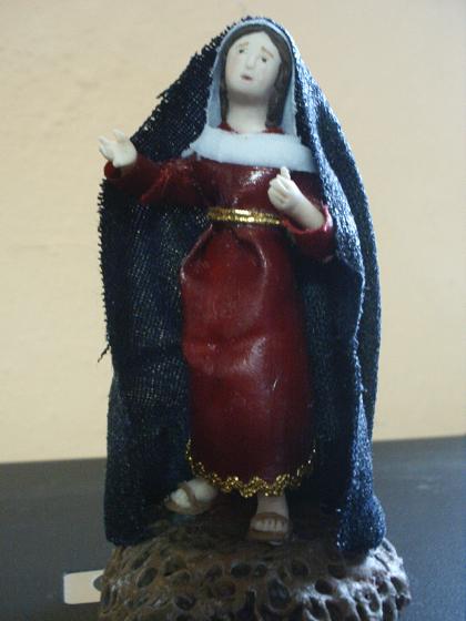 hola foreros. se que es un poco tarde, pero les presento mi Dolorosa hecha al estilo napolitano (si es q se puede decir q es de ese estilo) la cabeza, manos y pies están modelados en sculpey y decorados con acrilicas, lo mismo que la base (un truco es q tiene unicel dentro para que no sea tanto sculpey ). lo demas es tela remojada (y mil veces bañada) en cola y aguada de cola y pues cintillas para los efectos. fue trabajoso, pero este es el resultado. critiquen por favor y opinen. he visto que muchos de los vestidos de las diversas Dolorosas llevan bordados... ¿deberia yo aunque sea pintarle esos bordados a la mía? se me pasaba, mide desde sus pies a su cabeza alrededor de 8.4 cm y del ''piso'' a la cabeza alrededor de 10. bueno, pues opinen y felices pascuas (atrasadas)
