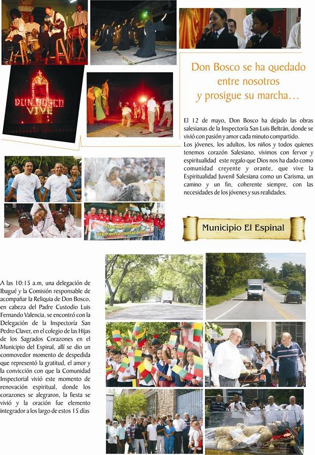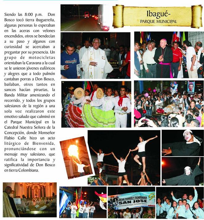 Y ya hoy está en Ibagué para ser entregado a la Inspectoría Salesiana con sede Bogotá, y nos hemos quedado con un vacío enorme pero llenos de gratitud con Don Bosco y con el rector mayor, por habernos proporcionado ésta alegría, ésta verdadera experiencia espiritual tan fuerte y por permitirnos pasar éstos días reunidos en torno a Don Bosco y vividos con toda la alegría que caracteriza la formación Salesiana. Señores, éste es mi país Colombia, lleno de gente buena, de gente pegada de Dios, fieles a nuestros principios religiosos, un país lleno de oración no puede ir mal y a los que les va a tocar vivir la experiencia prepárense, es algo extraordinario e indescriptible.