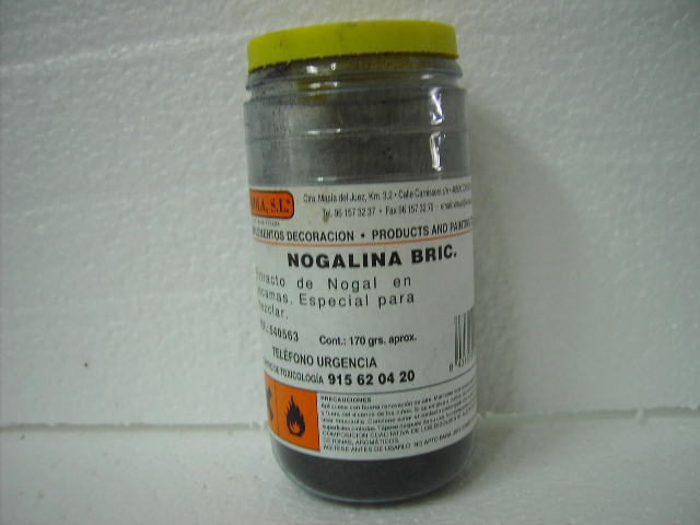 hola, 4 euros me costo a mi el botecito de 170 gm en escamas,es el que se ve arriba con la tapa amarilla ,recuerda ir hechando poco a poco la nogalina en agua que si te pasas ennegrece mucho ,mezclala si quieres en un tarro de cristal que si te sobra la puedas utilizar despues,un saludo