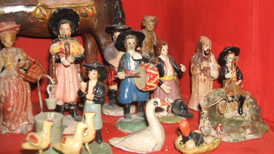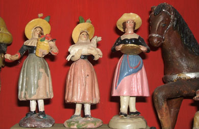 tienes unas figuras muy originales, algunas de ellas no las había visto nunca... me refiero en especial a esa señora con un cesto que se ve en la segunda foto a la izquierda. Yo personalmente tengo la de la "posada" con el posadero saliendo por la ventana, y me encanta ver lo que parece ser un "hombre de las nieves", nuestro queridísimo silvano, en segundo plano; también me encantan todos los personajes regionales con los grandes sombreros. Además, las figuras parecen realmente antiguas ¿de dónde vienen? ¿son herencia familiar o las has adquirido?
