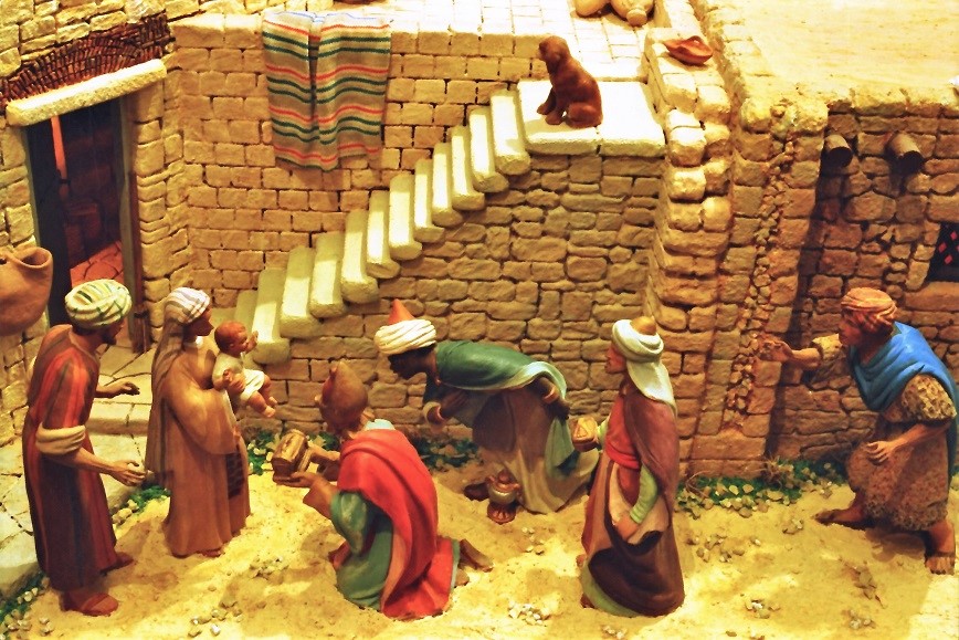 La escena de la Epifanía es mi preferida, y adjunto fotos de dos de las que he realizado. La primera con figuras de Castells en 16 cm. Y la segunda con figuras de Castells en 11 cm para el cortejo de pajes y camellos y de 8 cm para los magos adorando al Niño con la Virgen y San José.