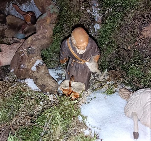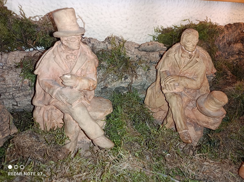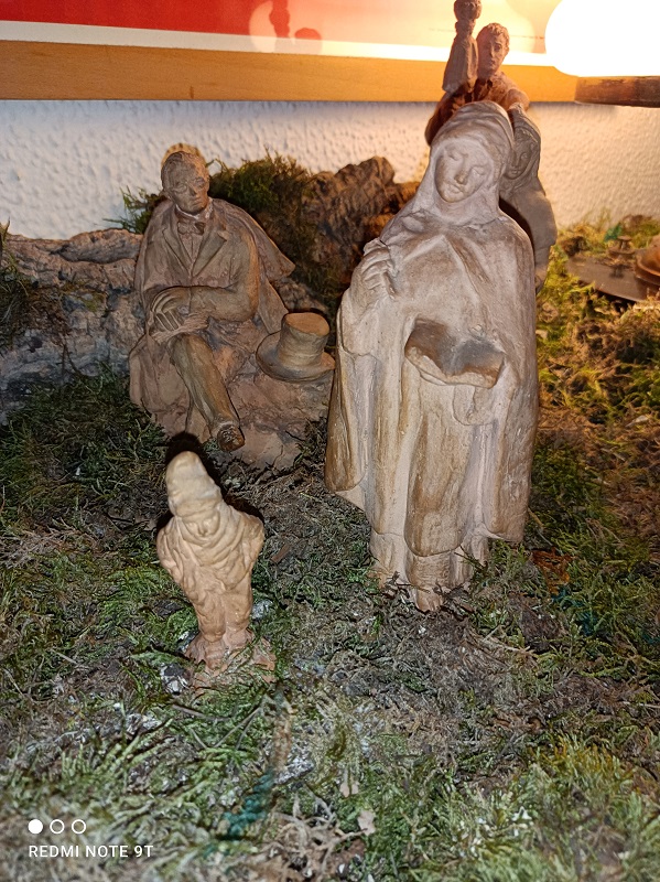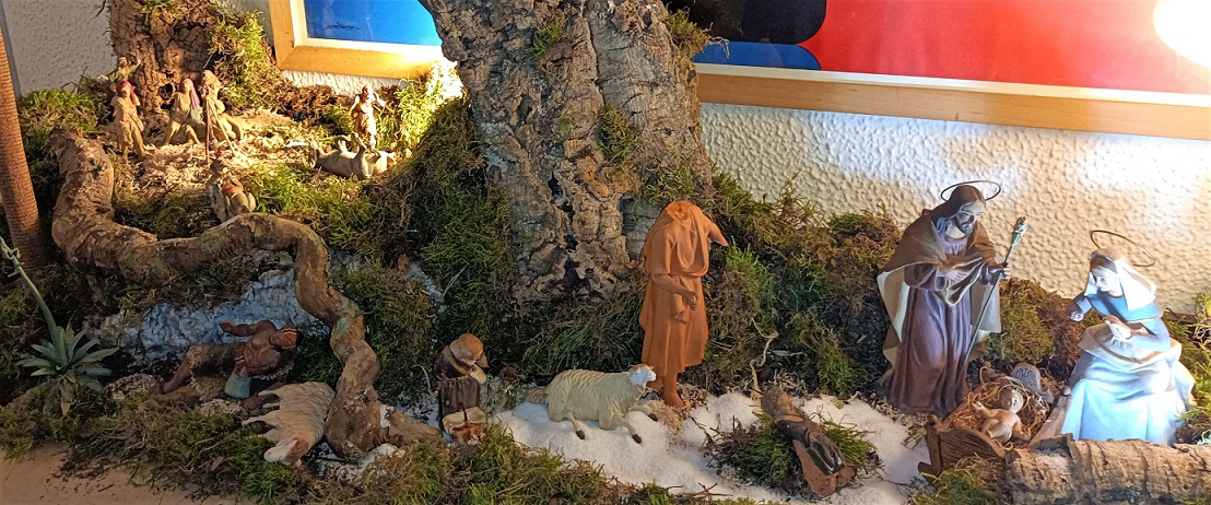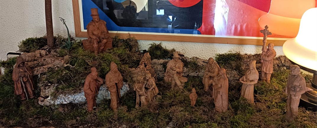 Es un belén de corcho y musgo tradicional, con la singularidad que por el van desfilando un cortejo de personajes maravillosos.