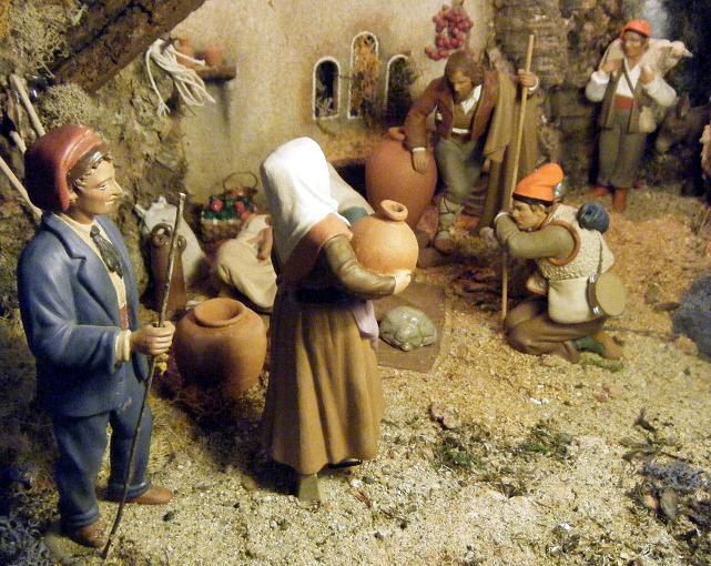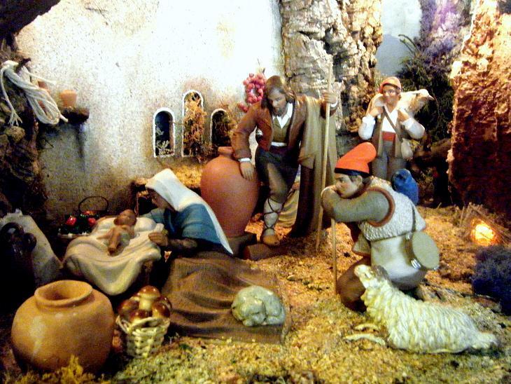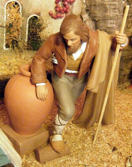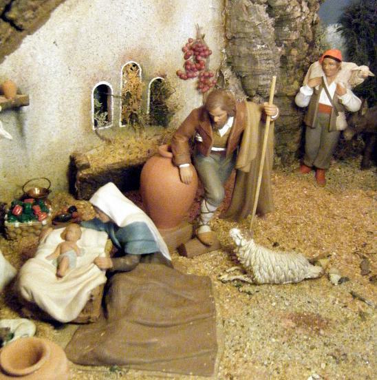El Niño duerme en el regazo de la madre mientras José contempla a ambos maravillado y algo confuso, sin tener muy claro si los problemas han finalizado o acaban de llegar, y como le tiemblan un poco las piernas, se sujeta firmemente a la tinaja (que hay colocada de forma extravagante en medio del portal) con un brazo mientras que con el otro sostiene firmemente su vara, que parece como si fuera a reverdecer y florecer de un momento a otro....