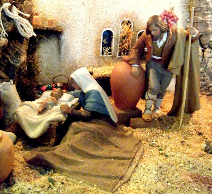 El Niño duerme en el regazo de la madre mientras José contempla a ambos maravillado y algo confuso, sin tener muy claro si los problemas han finalizado o acaban de llegar, y como le tiemblan un poco las piernas, se sujeta firmemente a la tinaja (que hay colocada de forma extravagante en medio del portal) con un brazo mientras que con el otro sostiene firmemente su vara, que parece como si fuera a reverdecer y florecer de un momento a otro....