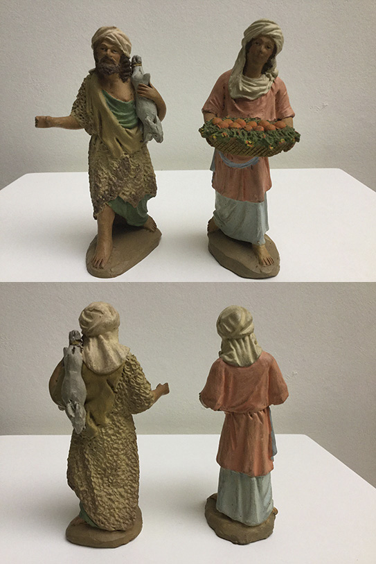 Marti Castells (Avi) el iniciador de saga, era tallador de madera, que pasó por necesidad al barro. Se inició como pudo, aprendiendo de la casi nada. Por tanto no es descabellado pensar que sus primeros modelados para hacer moldes, y sus primeros moldes fueron, si cabe, más achaparrados que los posteriores. Los barros se los preparaba el mismo, como posteriormente lo hicieron sus hijos (Marti, Joan y Josep) por este motivo., pueden observarse diversas calidades en las terracotas. Martí (Avi) trabajó mucho con moldes a la "colada", es decir barro líquido, por lo que estos es estropeaban mucho más rápido, y algunas copias salían menos definidas. Quiero pensar que pronto estilizó un poco más las figuras (no tanto como si hizo posteriormente su hijo). No me cuadran diversos detalles, como el pintado de los ojos, o el excesivo achaparramiento, pero, y lo digo muy sinceramente. si fueran mías, las valoraría mucho, pues sean o no de Martí Castells (Avi), majas y antiguas lo son