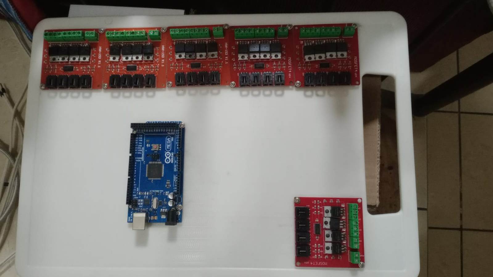 En la iluminación del horizonte pensamos utilizar Tiras LED RGB WS2813, la iluminación de las estrellas controladas por 4 Mosfet de 4 canales para activar 16 bloques de fibra optica que suman 800 hilos que hemos agrupado en grupos de 1, 2 y 3 hilos para crear diferentes tamaños de estrellas.