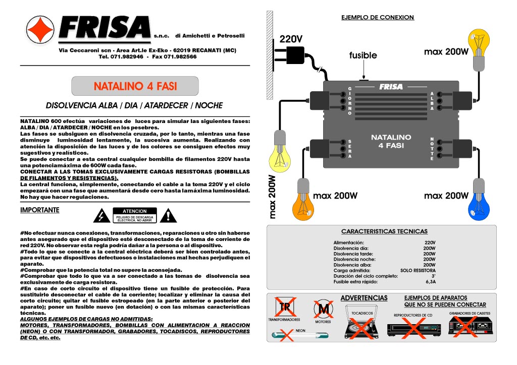Te comento porque este año he adquirido el natalino 4 fasi de la marca frisa, exactamente igual que el de las fotos que has puesto, pero me esta dando muchos problemas, y esta es la tercera vez que lo voy a cambiar por otro, nose que consejo me dais o si es que conecto algo mal, he mirado la potencia y no me sobrepaso de los 130W en ninguna de las fases, sobre todo el problema mas grave que le he detectado es que algunas veces pasa directamente de la fase amanecer a la fase atardecer, y tambien algunas veces cuando esta en la fase atardecer comienza a la vez la fase noche a encenderse y apagarse, asi hasta que la fase tardecer empieza a apagarse y ya entonces es cuando se enciende la fase noche completamente.